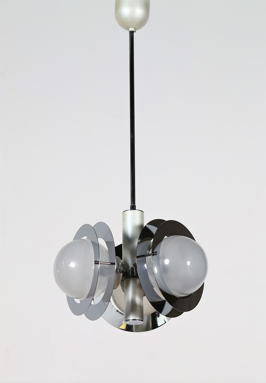 TRONCONI ENRICO Attrib. Chromed metal and glass chandelier with three lights, 1970s. . Cm 45,00 x 95,00 x 45,00.