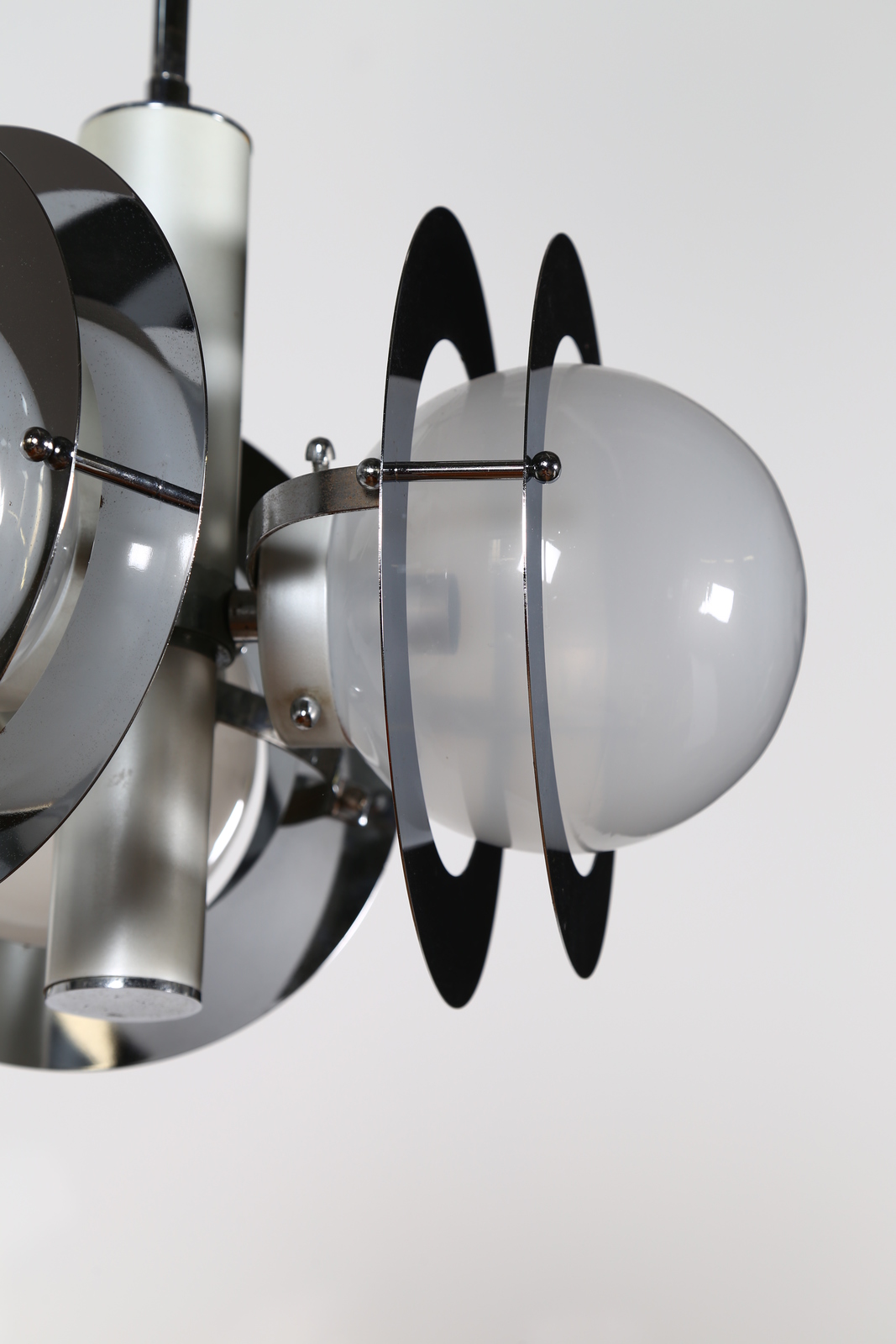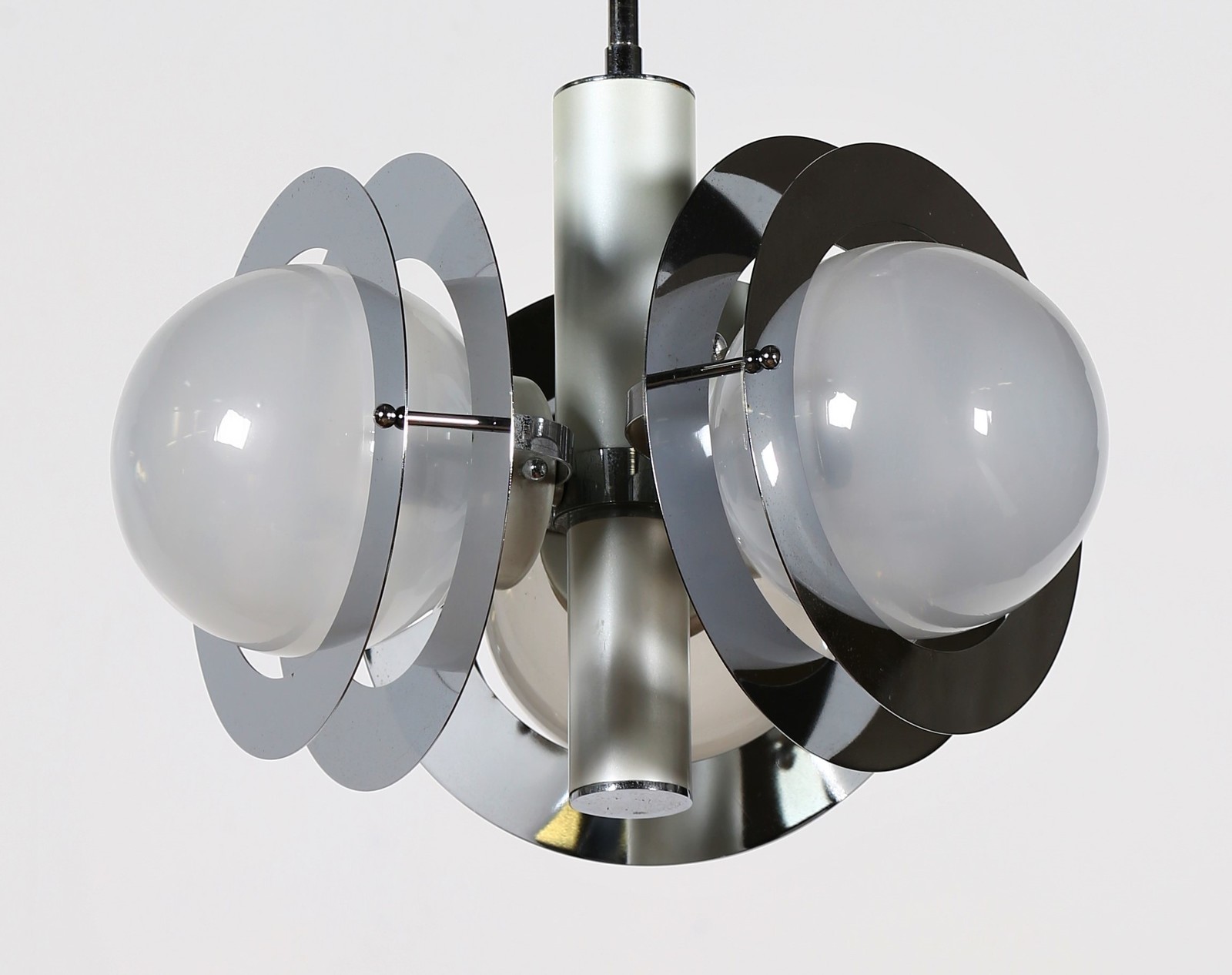TRONCONI ENRICO Attrib. Lampadario tre luci in metallo cromato e vetro, anni 70. -. Cm 45,00 x 95,00 x 45,00.