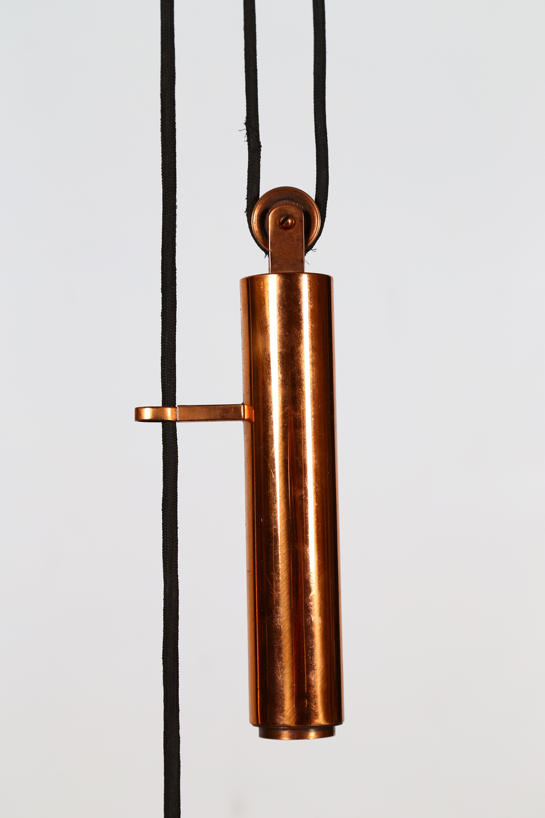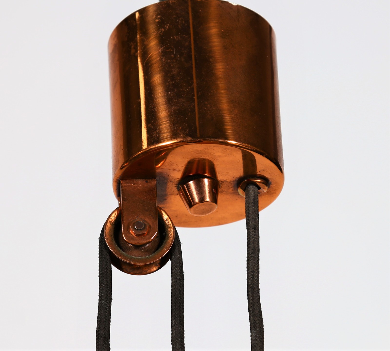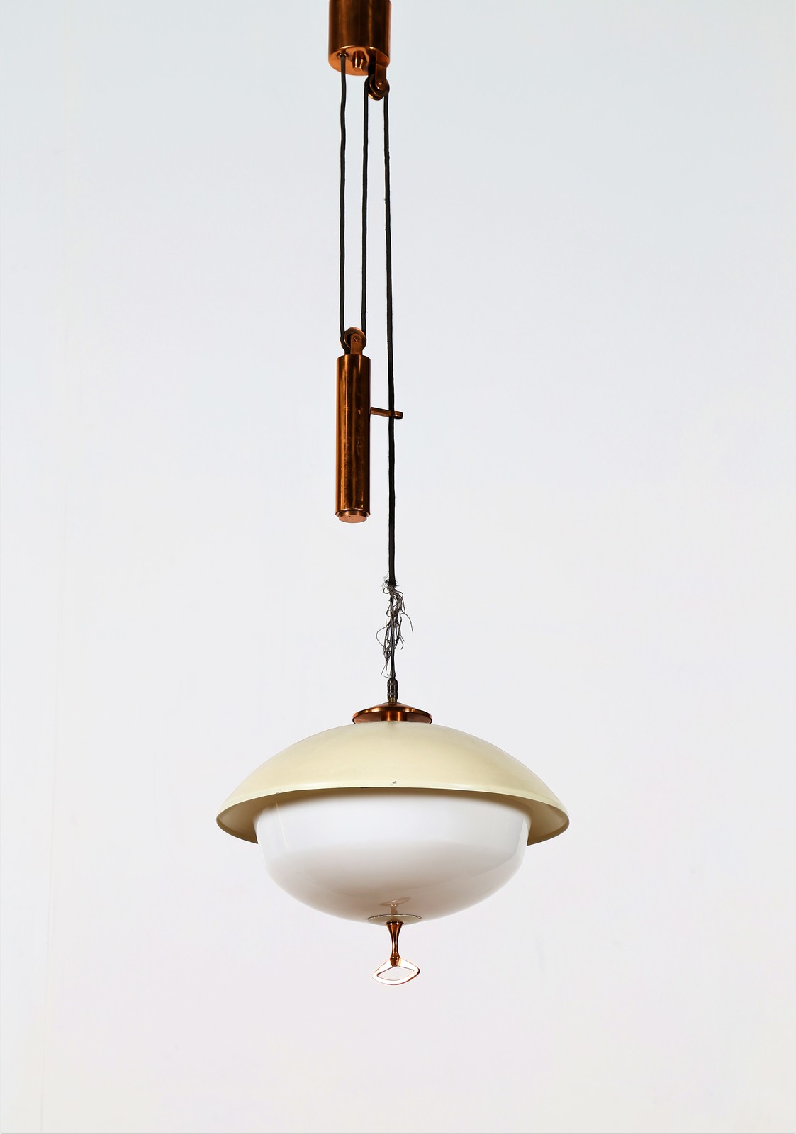 MANIFATTURA ITALIANA Lampada saliscendi in ottone, rame e perspex, anni 50. -. Cm 38,00 x 120,00 x 38,00.