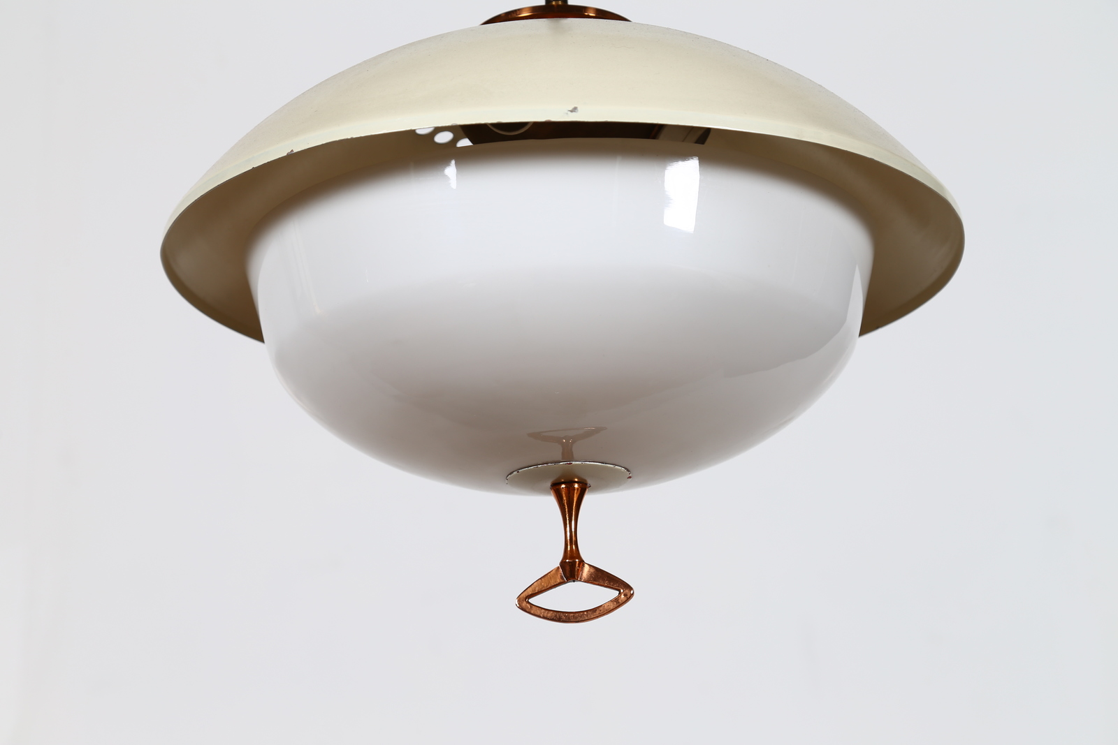 MANIFATTURA ITALIANA Lampada saliscendi in ottone, rame e perspex, anni 50....