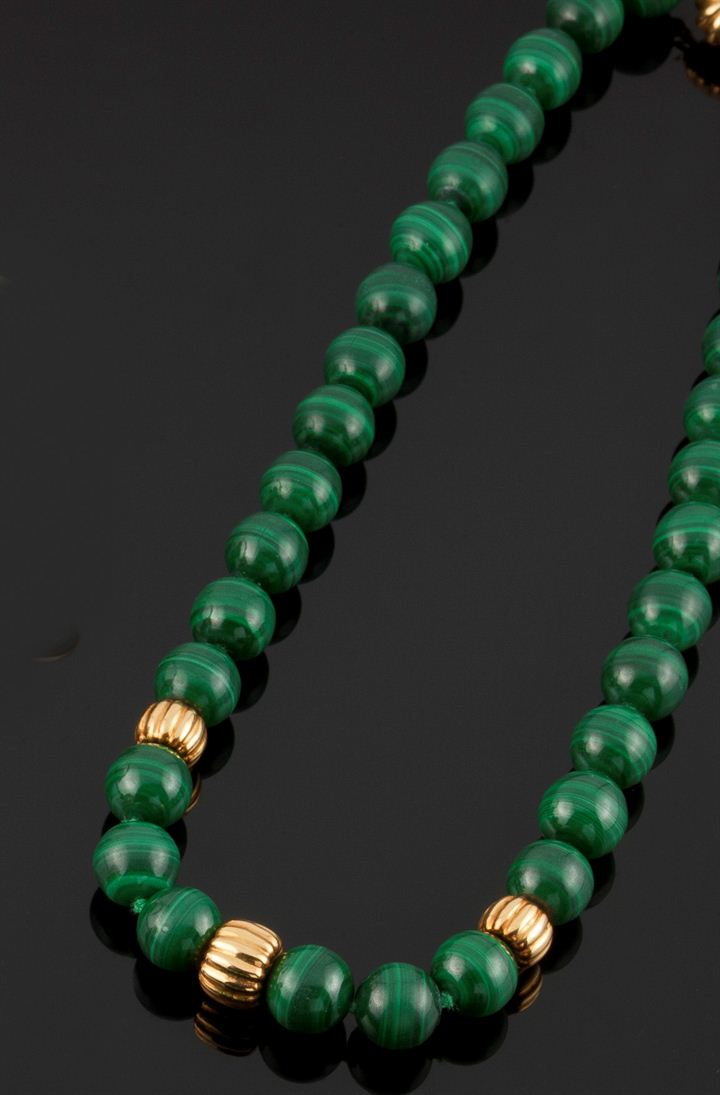 Collana composta da boules di malachite; distanziali a sfera e chiusura in oro giallo