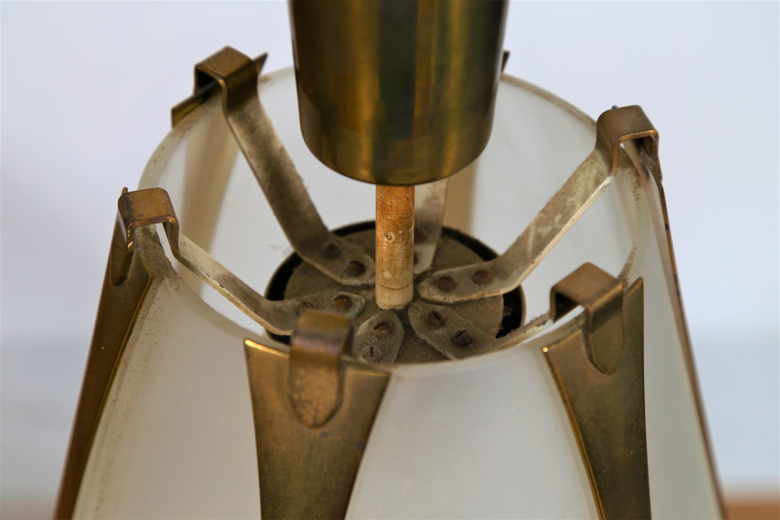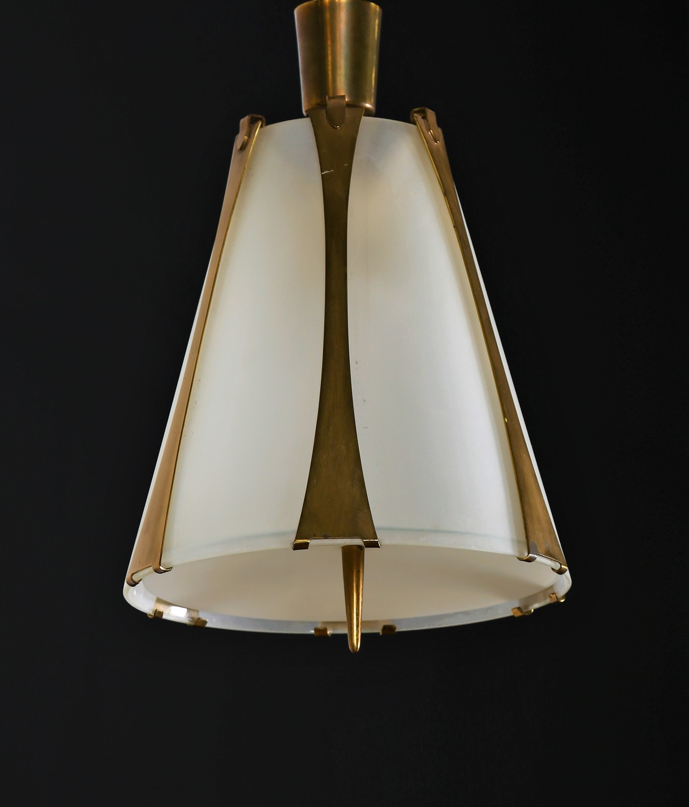 ARREDOLUCE Brass and frosted glass hanging lamp, 1950s. . Cm 27,00 x 40,00 x 27,00. Chain or pole missing