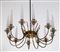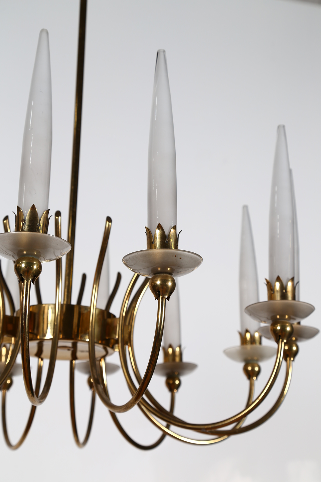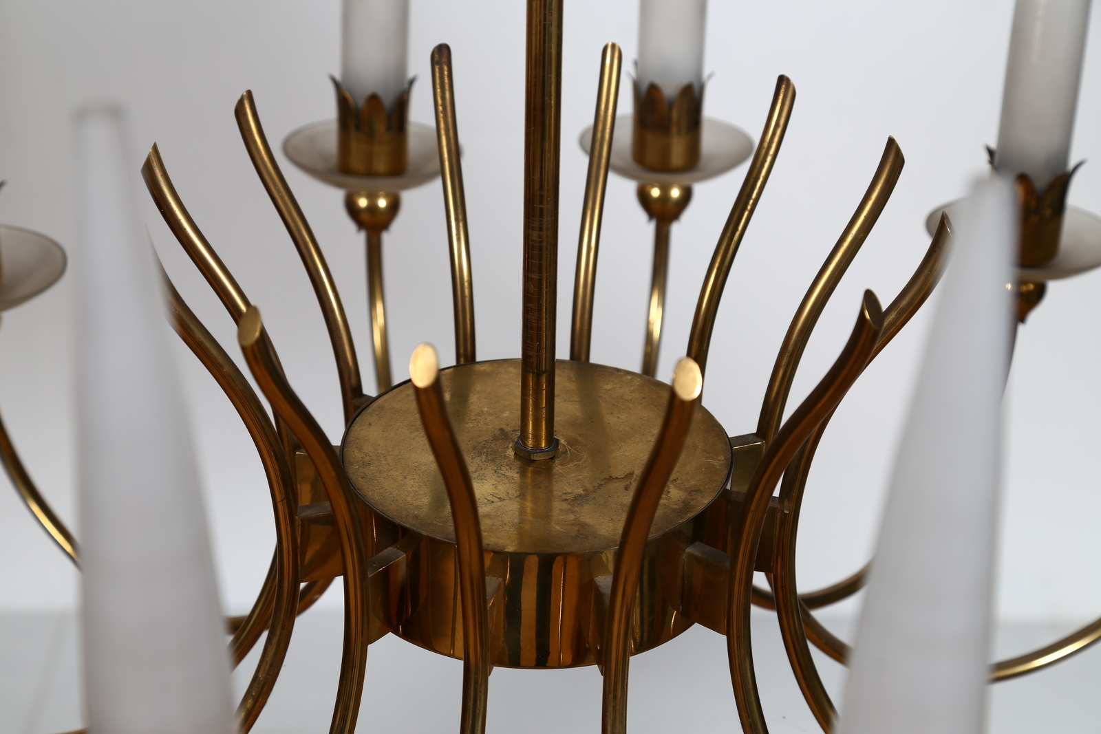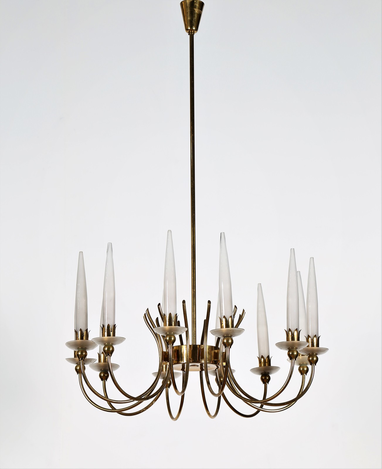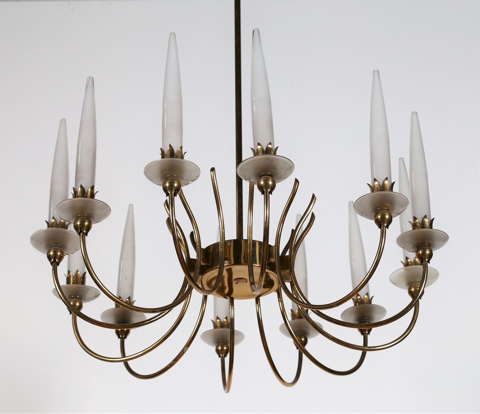 ARREDOLUCE Lampadario dodici luci in ottone e vetro satinato, anni 50. -. Cm 75,00 x 128,00 x 75,00.
