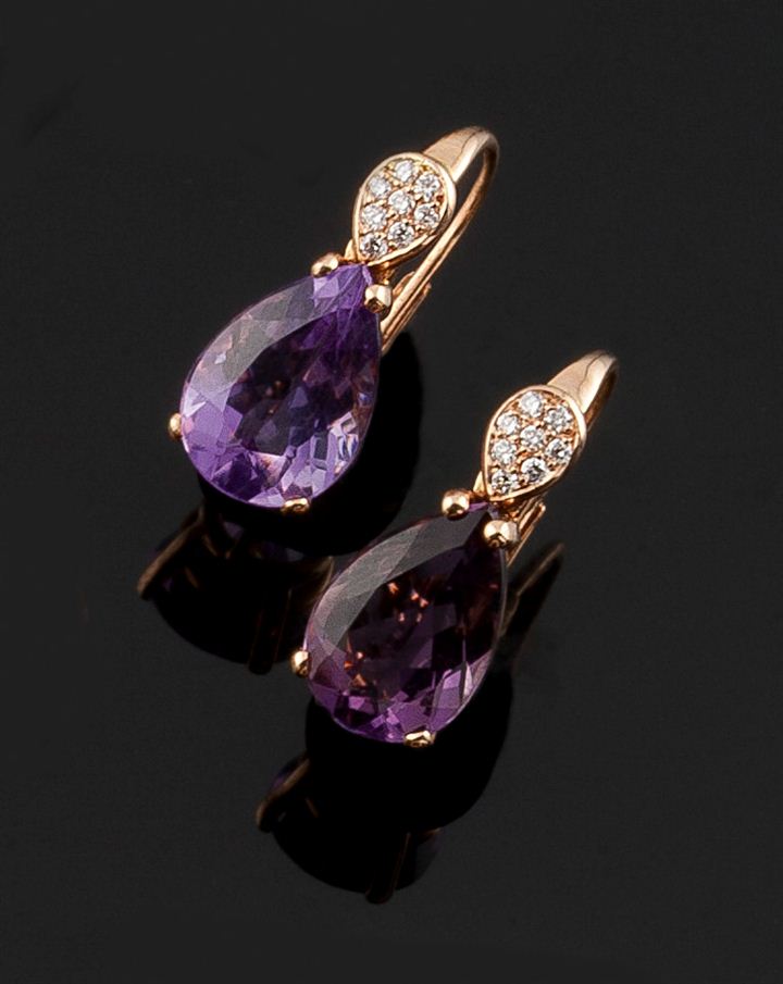 due ametiste taglio a goccia e diamanti taglio brillante per complessivi ct 0,15 ca