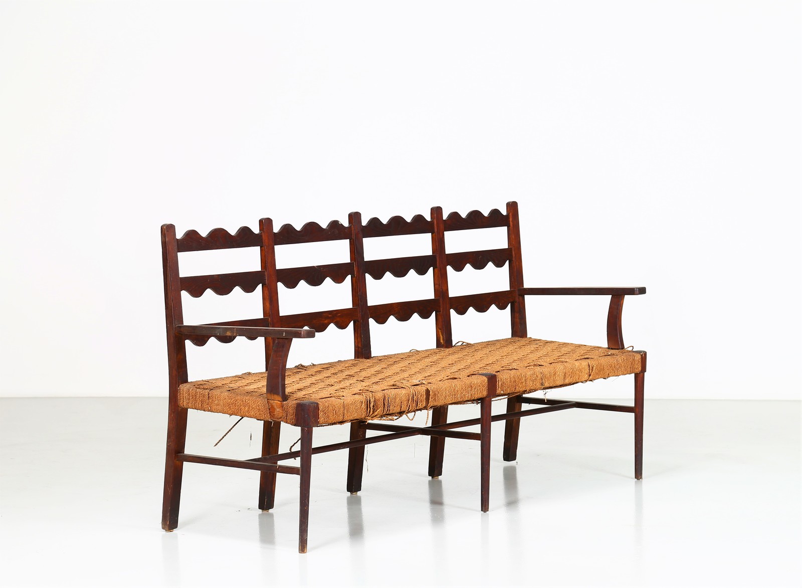 BUFFA PAOLO (1903 - 1970) Panca quattro posti in legno e paglia, anni 50. -....
