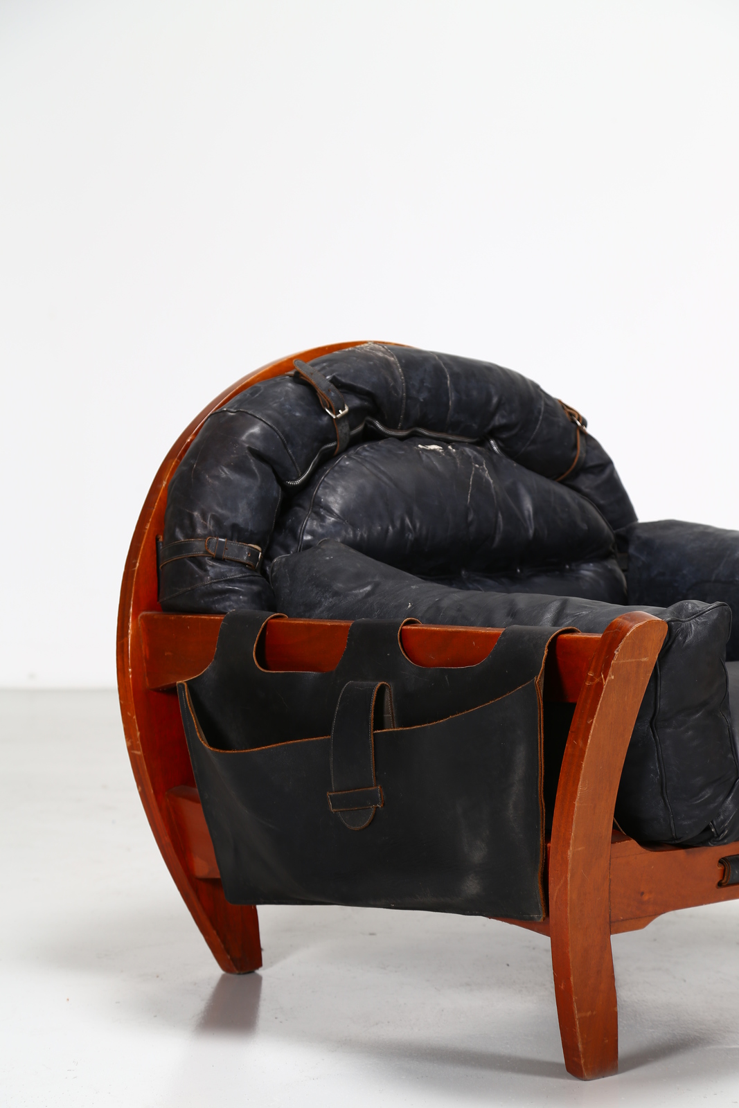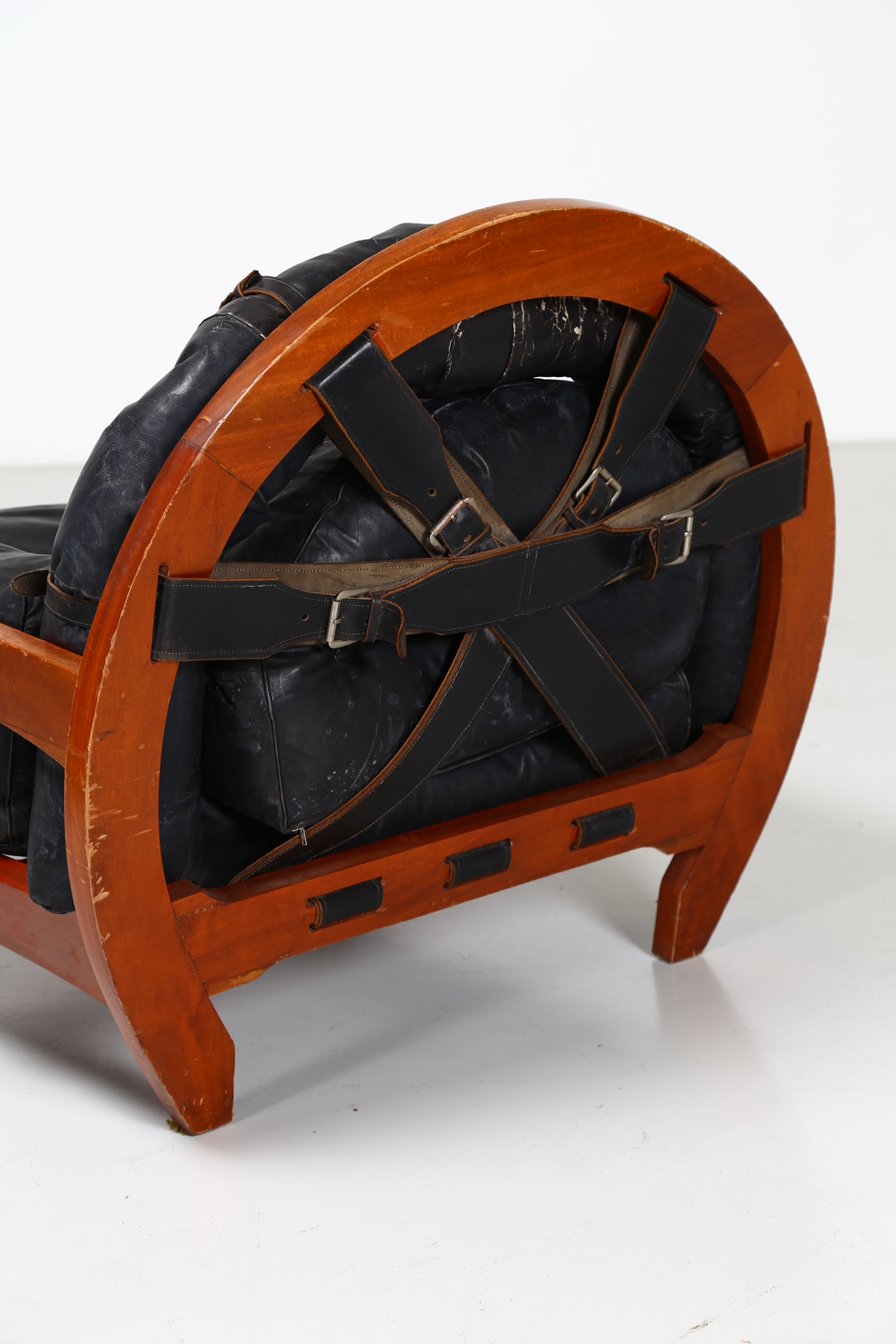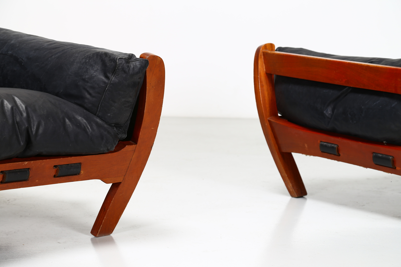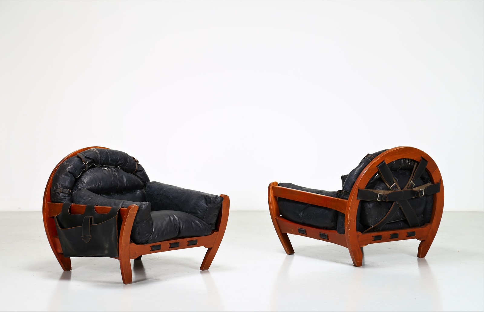 FRIGERIO LUCIANO Attrib. Pair of wood and leather armchairs, 1970s. . Cm 90,00 x 79,00 x 94,00.