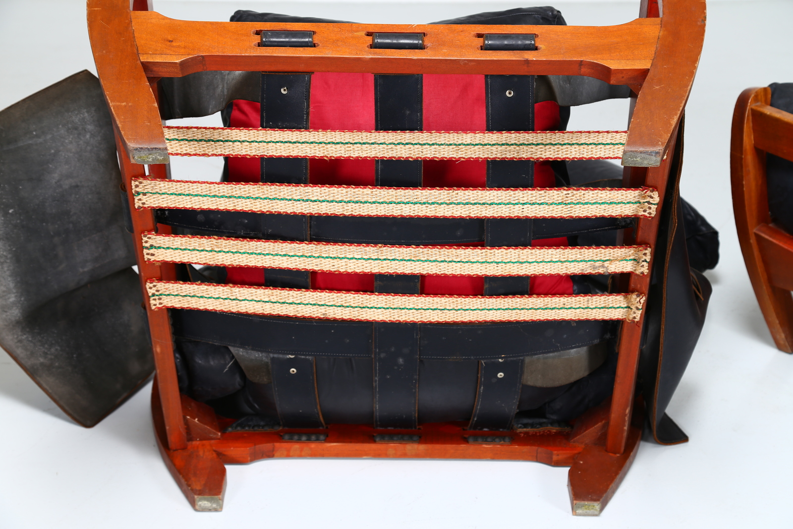 FRIGERIO LUCIANO Attrib. Coppia di poltrone in legno e cuoio, anni 70. -. Cm...
