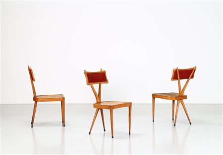VIGORELLI GIANNI Tre sedie in legno e tessuto originale, anni 50. -. Cm 44,00...