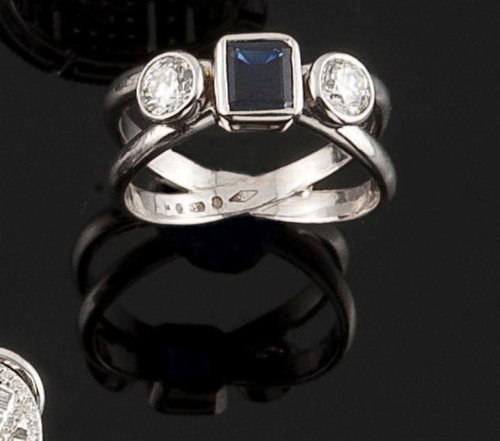 Anello in oro bianco con al centro uno zaffiro taglio rettangolare ed ai lati due diamanti taglio