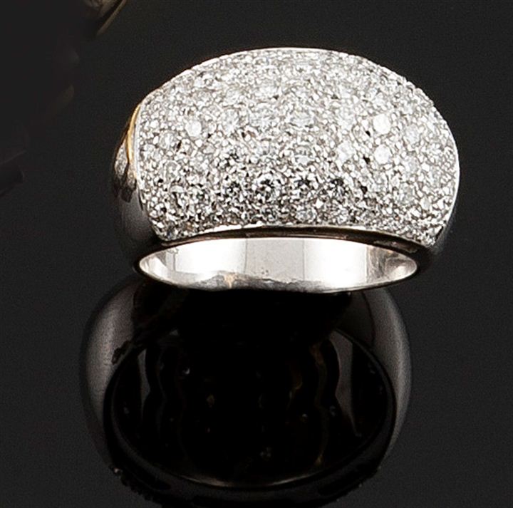 Anello in oro bianco, sommità con pavè di diamanti taglio billante per complessivi ct 2,10 ca