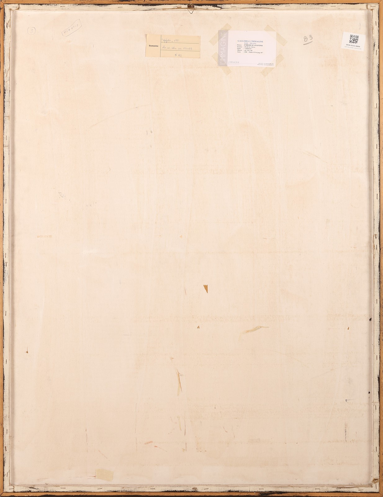 SCANAVINO EMILIO (1922 - 1986) Appeso. . 1981. Olio su tela tamburata. Cm 89,00 x 116,00. Al retro cartiglio descrittivo Galleria l'immagine e cartiglio descrittivo dell'artista. Autentica su fotografia di Giorgina Scanavino. Pubblicazioni: Catalogo generale delle opere di Emilio Scanavino a cura di Giorgina Scanavino e Carlo Pirovano, Volume II, Ed. Electa, numero 1981 - 126. Presenti lievi difetti. Cornice presente