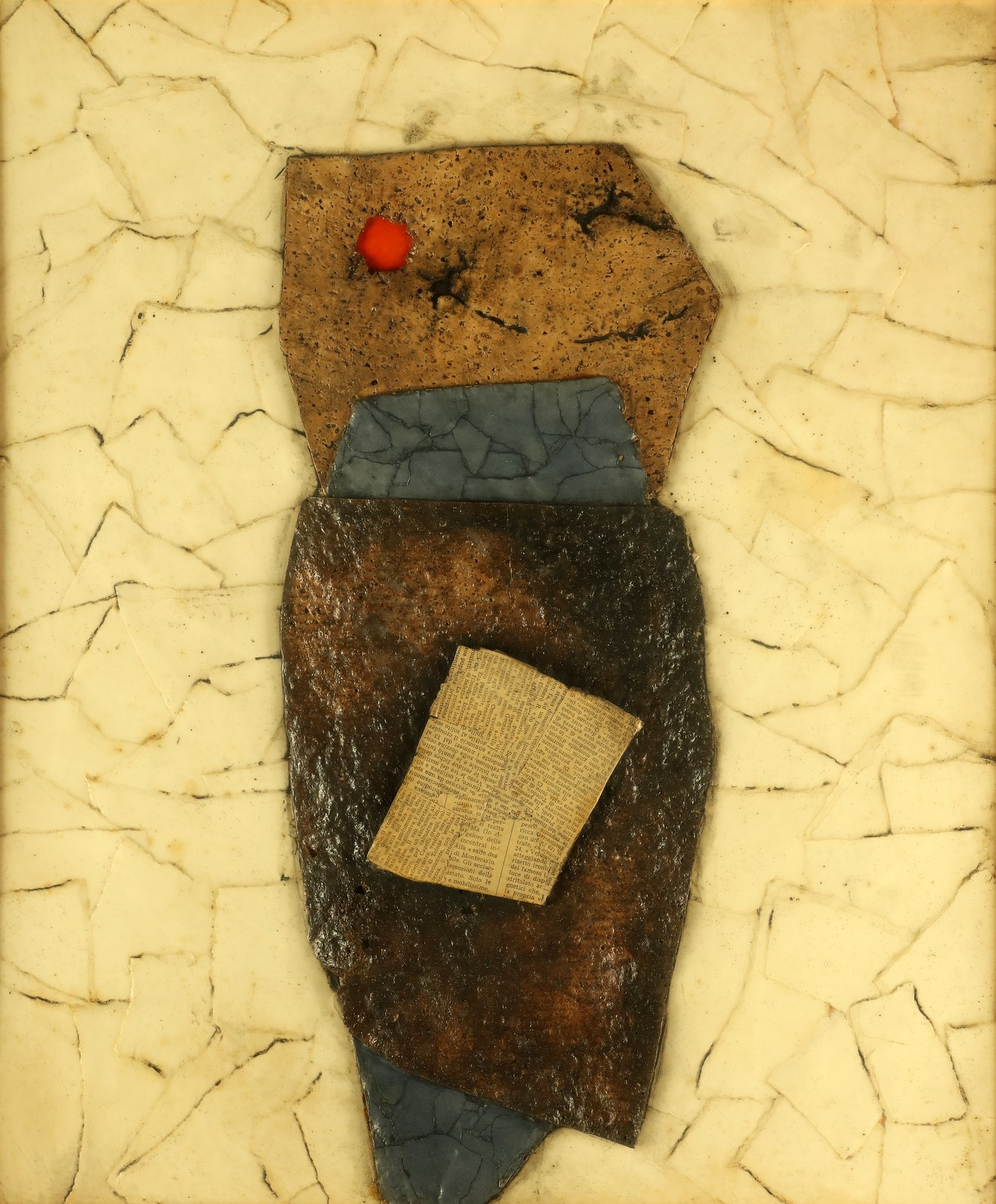 CRIPPA ROBERTO GAETANO (1921 - 1972) Execution. 1966. Oil, collage and cork on board. Cm 50,00 x 60,00. At the back title, signature, year and dedication. Roberta Crippa jr's authenticity certificate on photo. Telemarket's authenticity certificate. Cornice presente