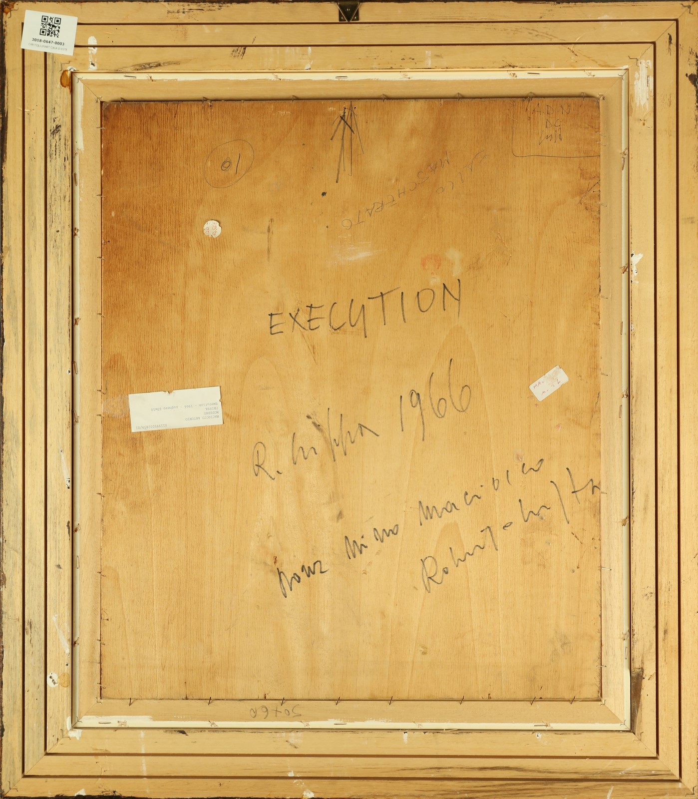 CRIPPA ROBERTO GAETANO (1921 - 1972) Execution. 1966. Olio, collage e sughero su tavola. Cm 50,00 x 60,00. Al retro titolo, firma, anno e dedica. Autentica su fotografia di Roberto Crippa Jr. Certificato di autenticità Telemarket, Roncadelle (Bs). Cornice presente