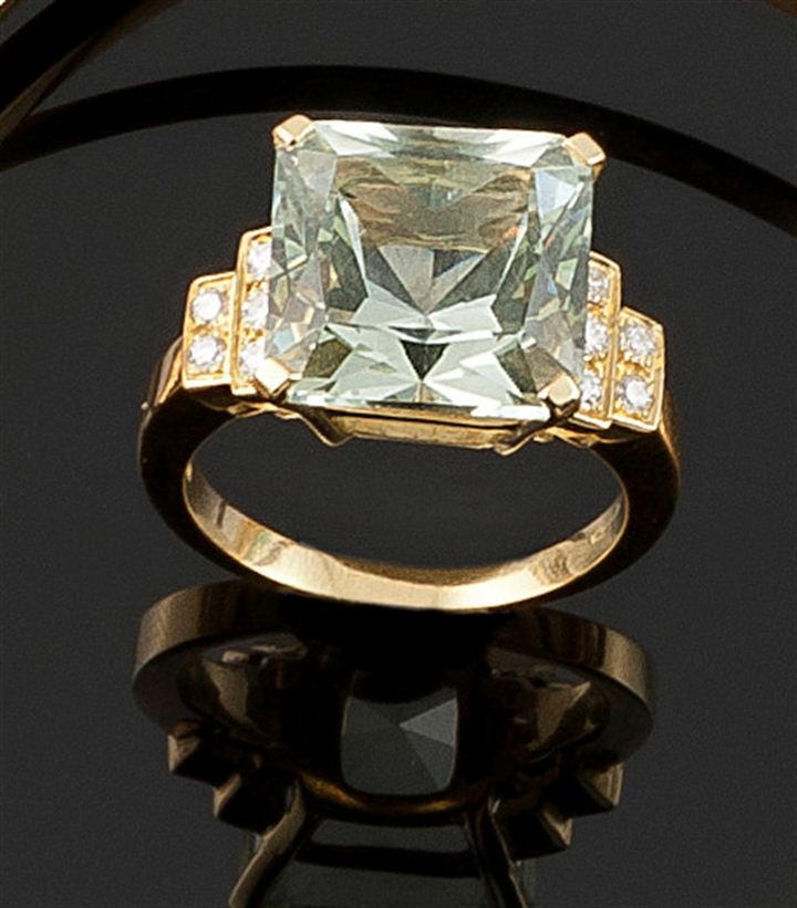 Anello in oro giallo con grande acquamarina verde taglio carrè di ct 9,67; ai lati diamantini