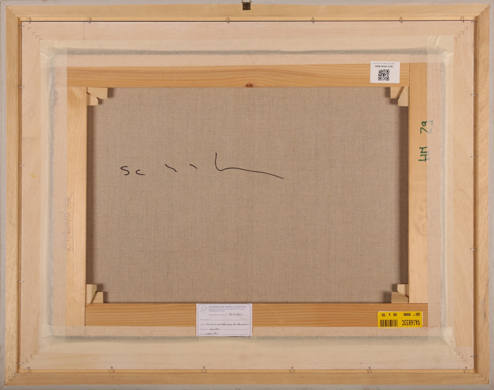 SCHIFANO MARIO (1934 - 1998) Untitled. . Cm 70,00 x 50,00. Signature at the back. Mario Schifano- Multistudio Archive's authenticity certificate on photo (1st February 2002). Meetingart Auction House's authenticity certificate.1990/1995. Publication: Mario Schifano canvas artwork's catalog, 1983 - 1990/97, VolumeII, i.605. Cornice presente