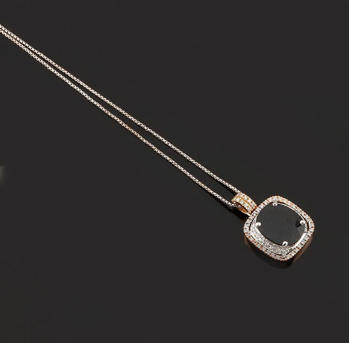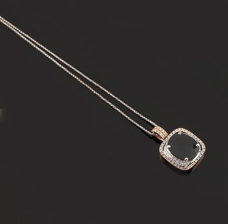 Catena in oro bianco con ciondolo di forma quadrata in oro giallo e bianco, con al centro grande zaffiro di ct 9,75, circondato da un doppio contorno di diamanti taglio brillante per complessivi ct 0,56 ca