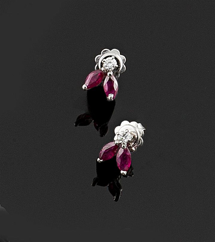 Coppia di orecchini in oro bianco, a lobo, al centro due diamanti taglio brillante per complessivi ct 0,15