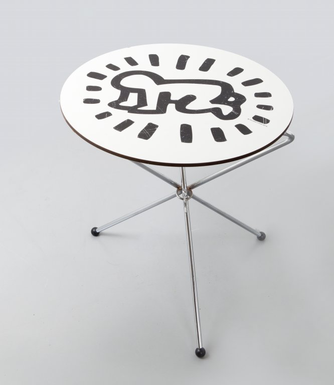 KEITH HARING (1958-1990) Rududutavolino pieghevole, gambe in metallo cromato,...