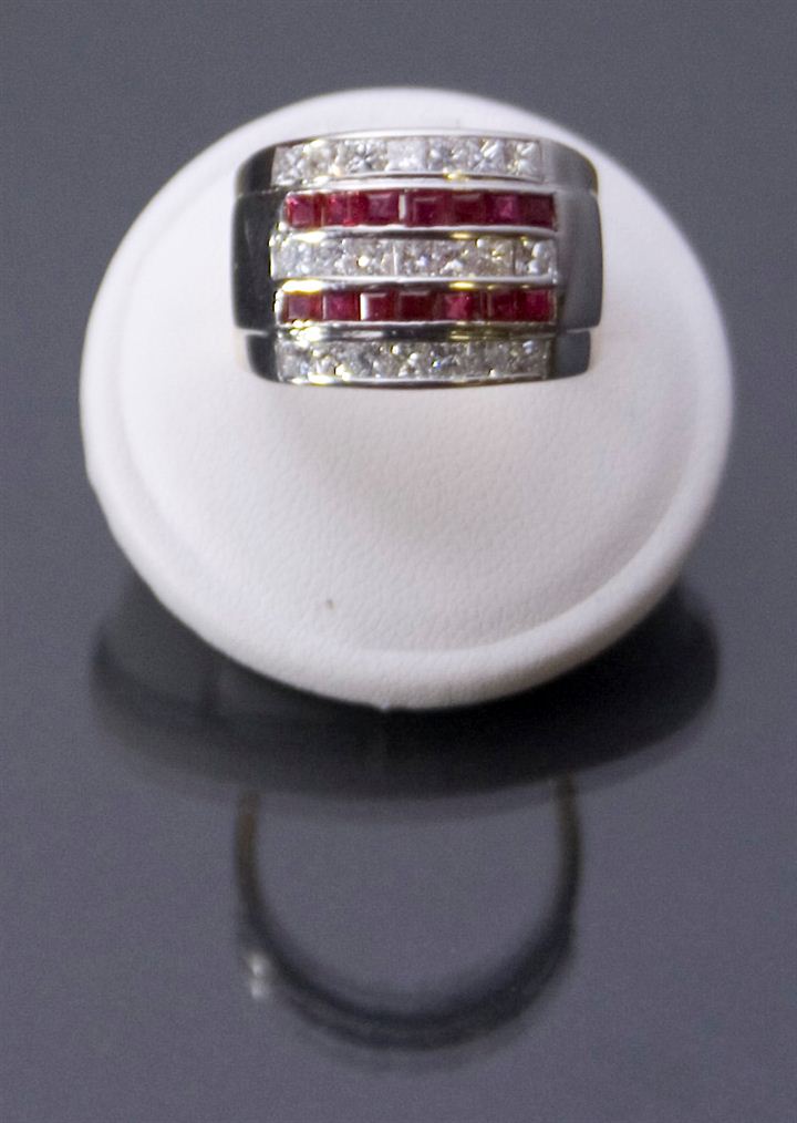 oro bianco con doppia fila di rubini taglio carré per complessivi ct 1,00, alternati a tre file di diamanti taglio princess per complessivi ct 1,68