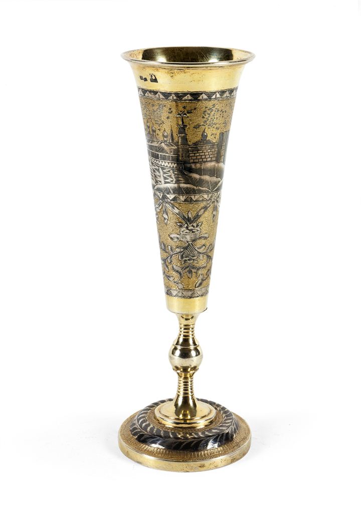 niellato a motivi di paesaggi con palazzi e fortificazioni; stelo assottigliato poggiante su base circolare