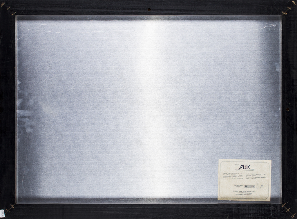 Etichetta delle Edizioni Jabik Arte Moltiplicata (MI) con firma a penna dell'Artista e indicazione della numerazione (Esemplare 229/500)