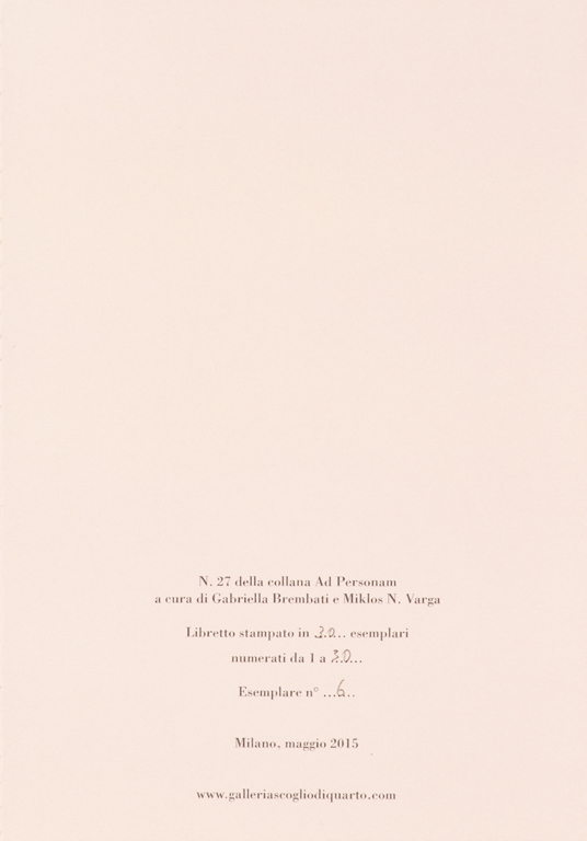 L'opera è entro libretto originale con poesia di Miklos N. Varga realizzato dalla Galleria Scoglio di Quarto in occasione della collettiva Ad Personam per la quale venivano realizzati 30 libretti contenenti 1 pezzo unico per ogni Artista