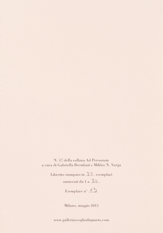 L'opera è entro libretto originale con poesia di Miklos N. Varga realizzato dalla Galleria Scoglio di Quarto in occasione della collettiva Ad Personam per la quale venivano realizzati 30 libretti contenenti 1 pezzo unico per ogni Artista