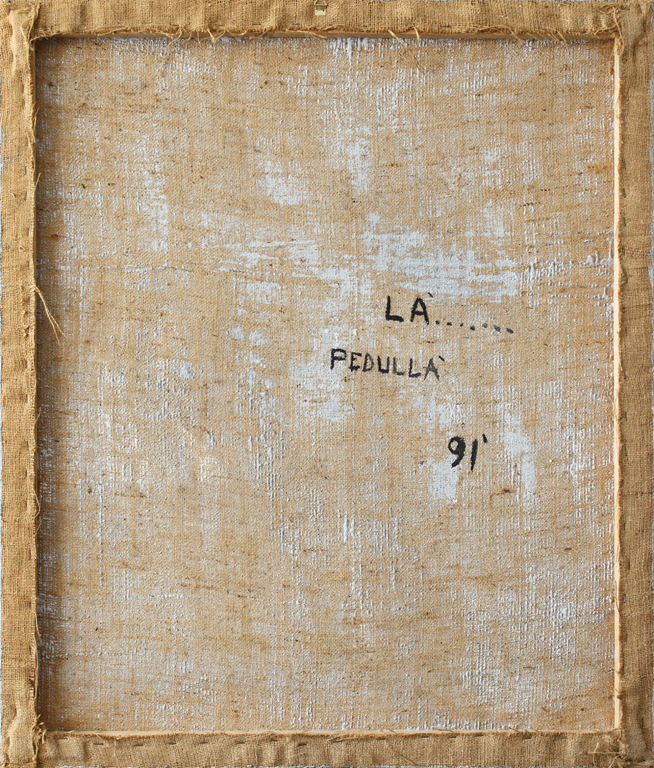 Lotto 324 | GIANNI PEDULLA (1959)Là..., 1991Olio e applicazioni su tela di jutacm...