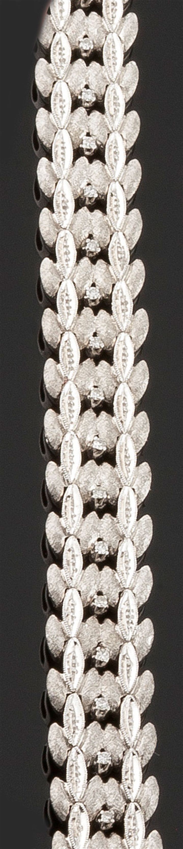 Bracciale in oro bianco composto da piccole foglie lucide e satinate con diamanti taglio 8/8 per complessivi 0,30 ca