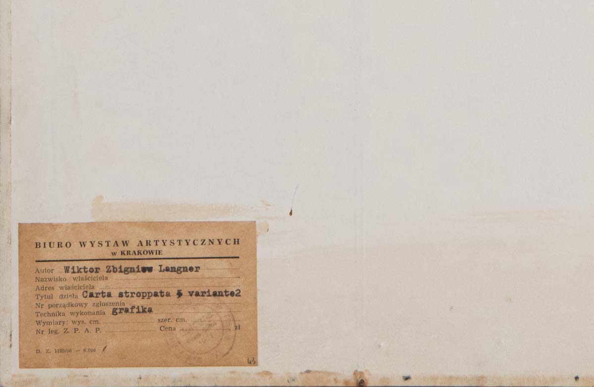 Wiktor Zbigniew Langner (1906-1985), “Carta stroppata - variante 2”. Opera grafica su carta, etichetta al retro ‘Biuro Wystaw Artystycznych w Krakowie’, H mm 750x350