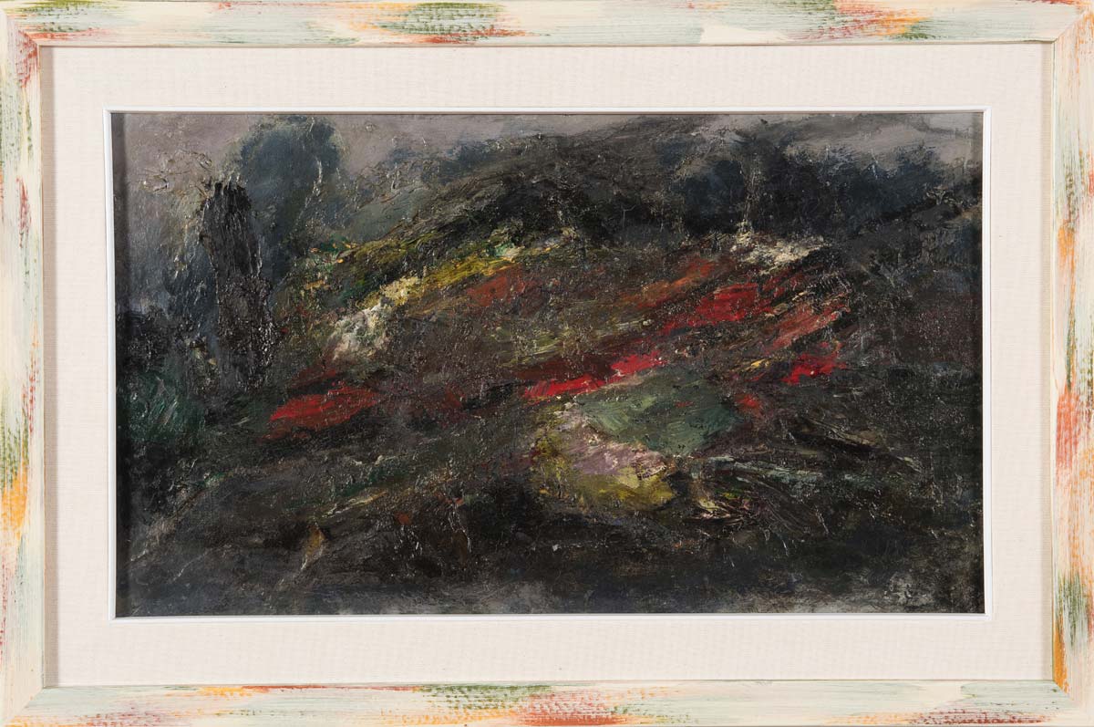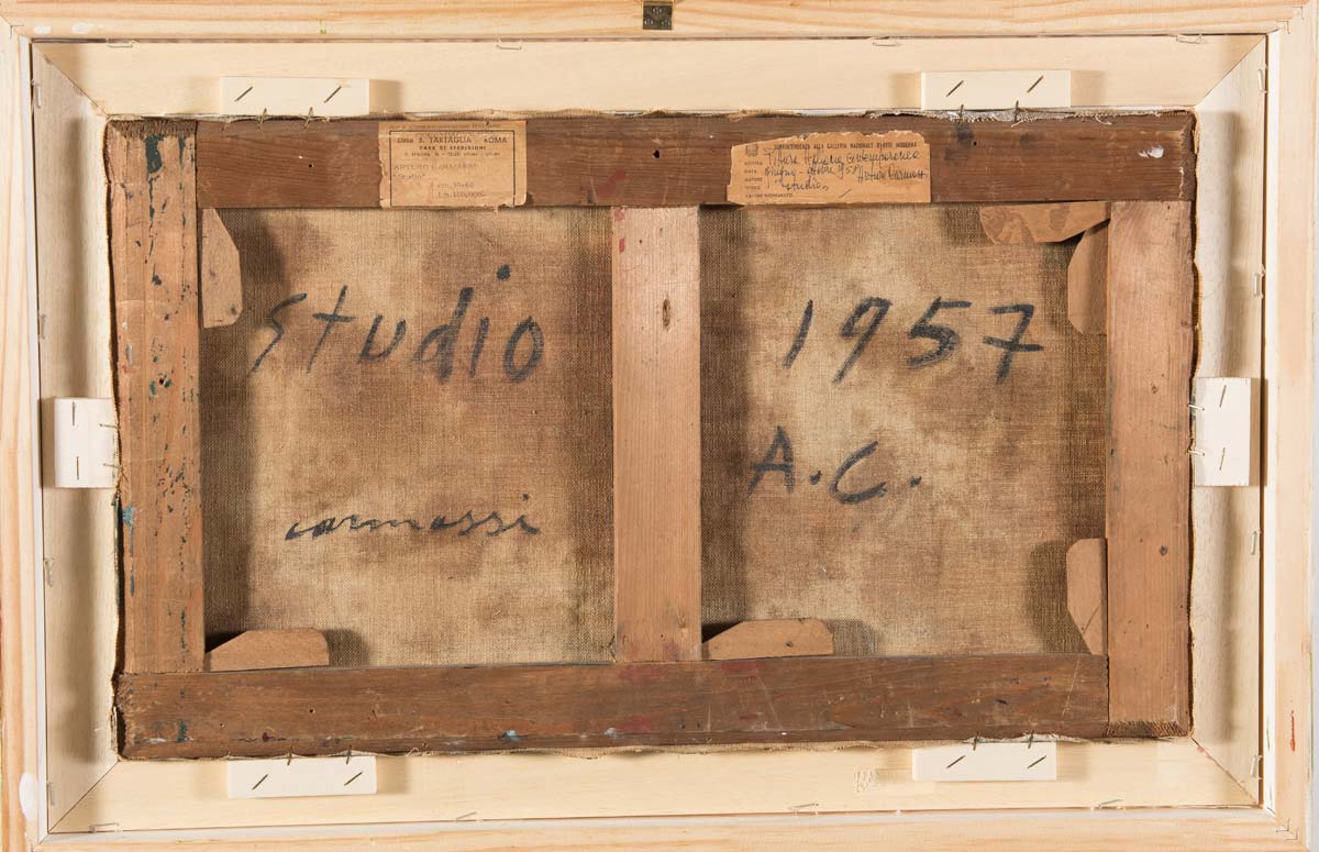 Arturo Carmassi (Lucca 1925 – Empoli 2015), “Studio”, 1957. Olio su tela, al retro reca titolo, firma e data ‘ Studio – Carmassi – 1957 A.C.’, H cm 35x60