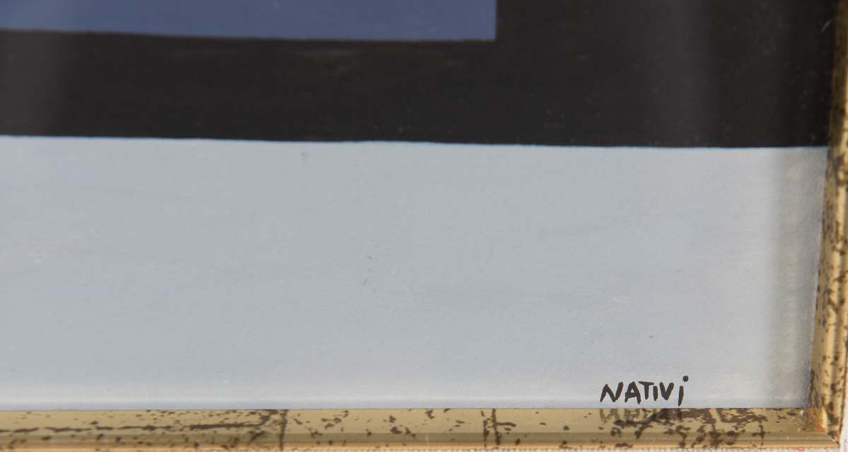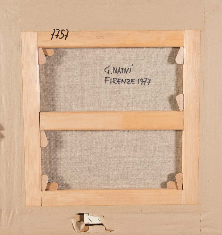 Gualtiero Nativi (Pistoia 1921 – Siena 1999), “Elogio della solitudine 2”, 1977. Acrilico su carta riportato su tela, firmato in basso a destra Nativi, al retro reca firma e data ‘G Nativi – Firenze 1977’, sul telaio numero di archivio 7757, H cm 50x50