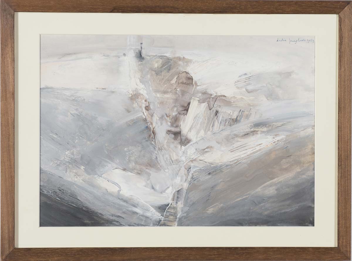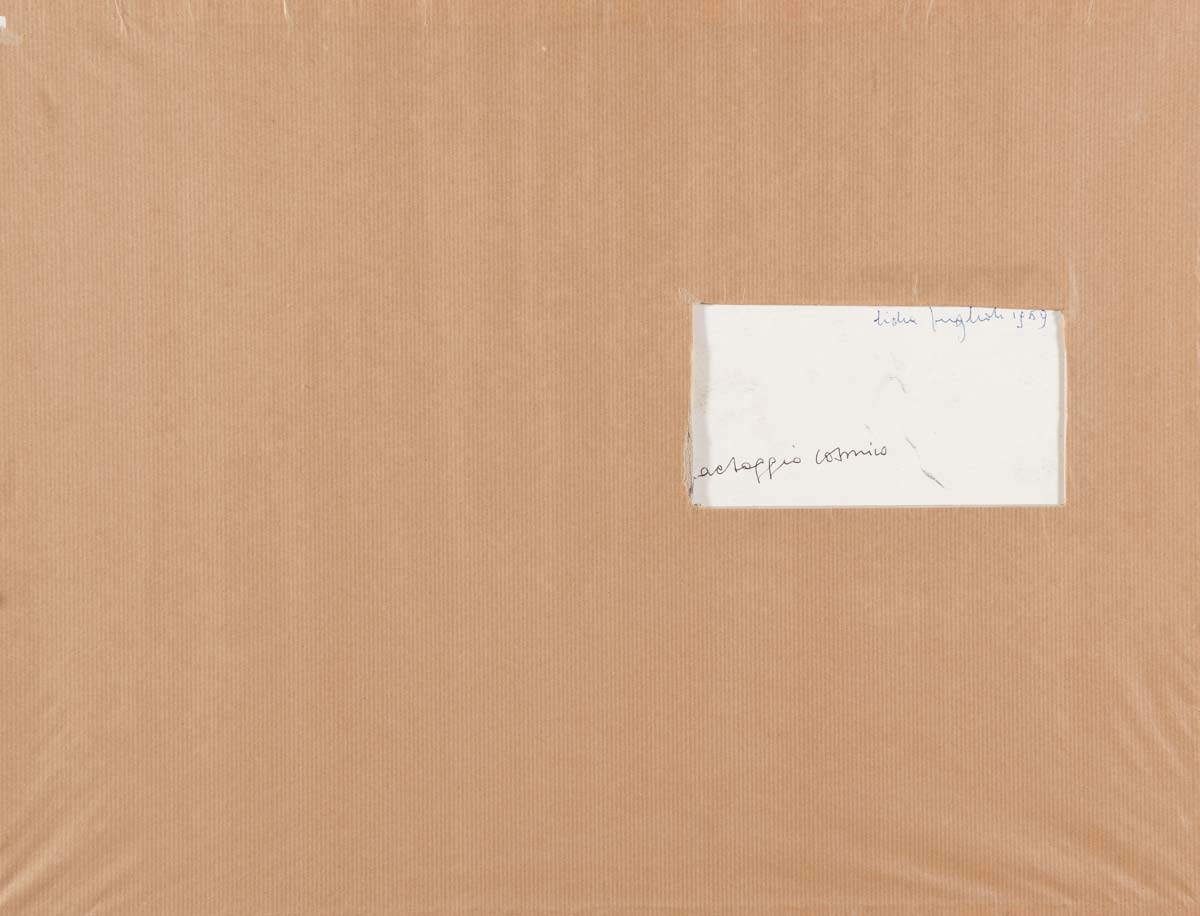 Lidia Puglioli (San Lazzaro di Savena 1919 - Bologna 2013), “Paesaggio Cosmico”, 1959. Olio e tecnica mista si carta, firmato e datato in alto a destra Lidia Puglioli 1959, al retro reca firma, datata e titolo ‘Lidia Puglioli – Paesaggio Cosmico – 1959’, H cm 34x49
