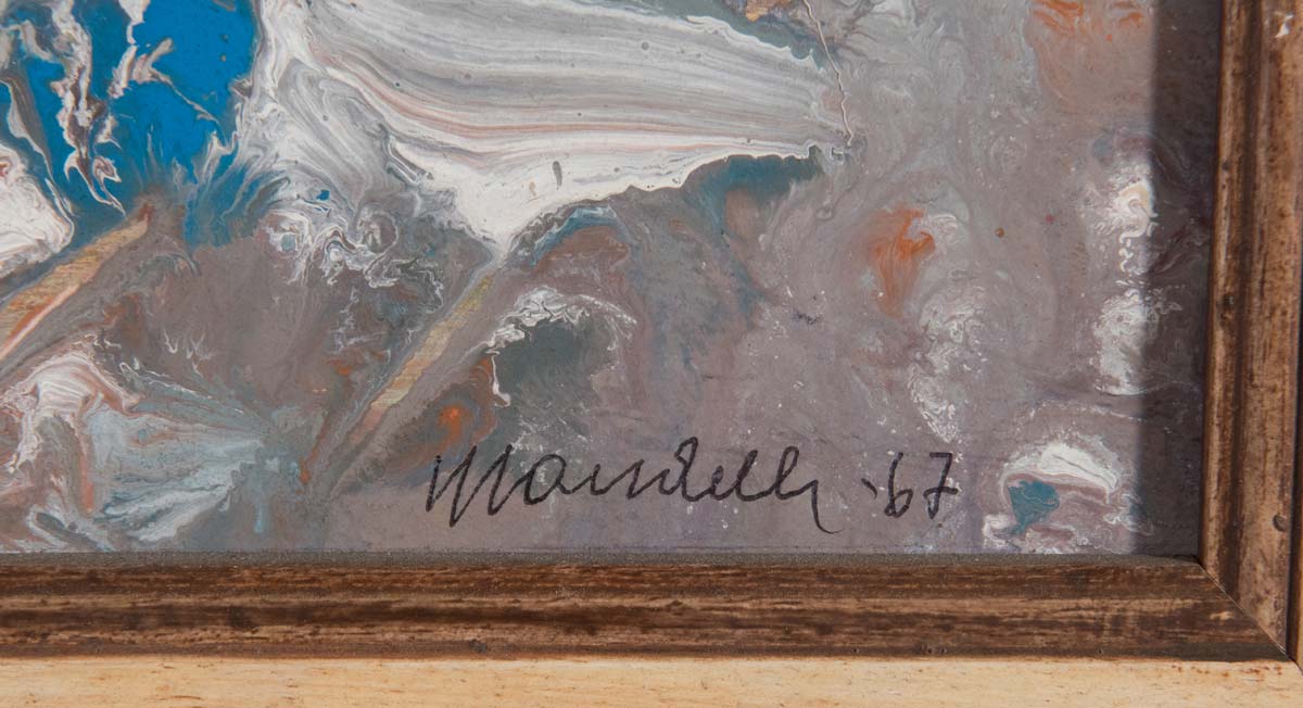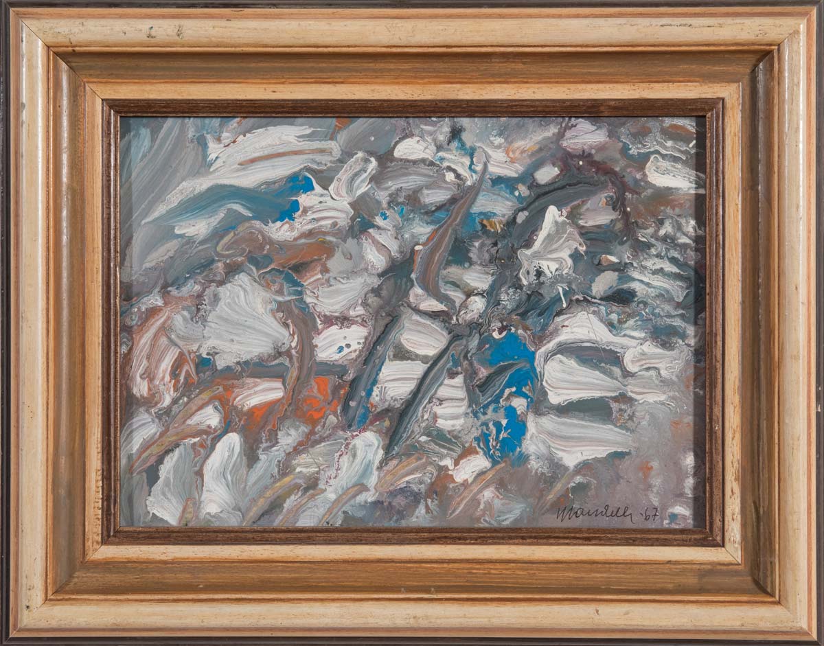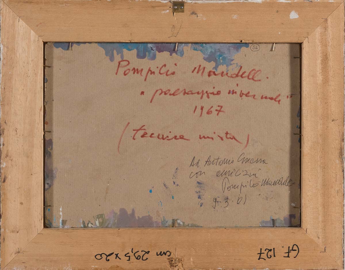 Pompilio Mandelli (Luzzara 1912 – Bologna 2006), “Paesaggio invernale”, 1967. Tempera acrilica su cartone, firmata e datata in basso a destra Mandelli 67, al retro reca firma, titolo e data ‘Pompilio Mandelli - ‘paesaggio invernale’ - 1967’, H cm 23x32