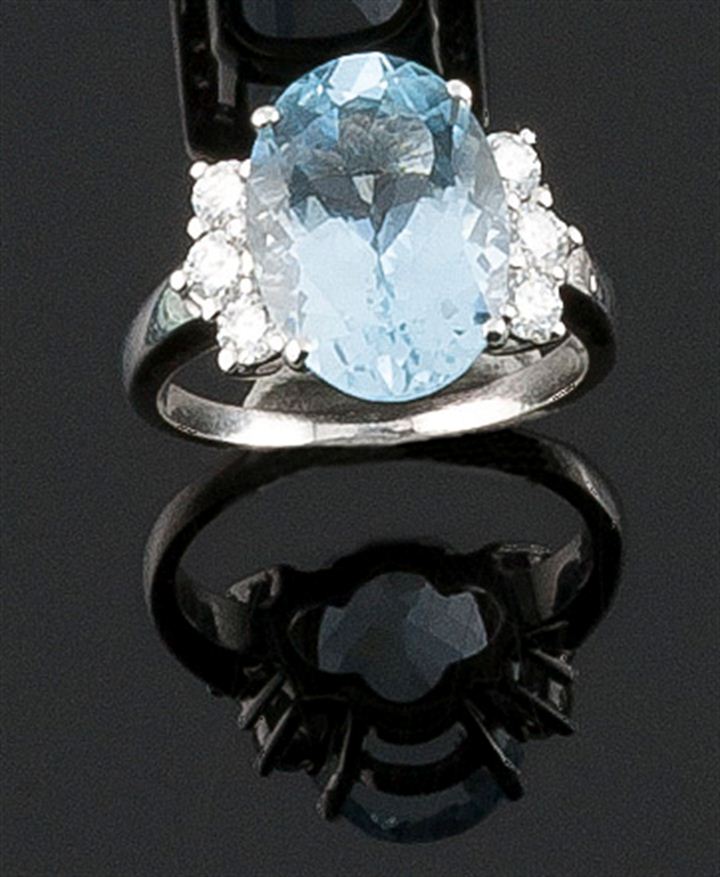 Anello in oro bianco con al centro acquamarina di taglio ovale di ct 5,77 ca, ai lati sei diamanti taglio brillante