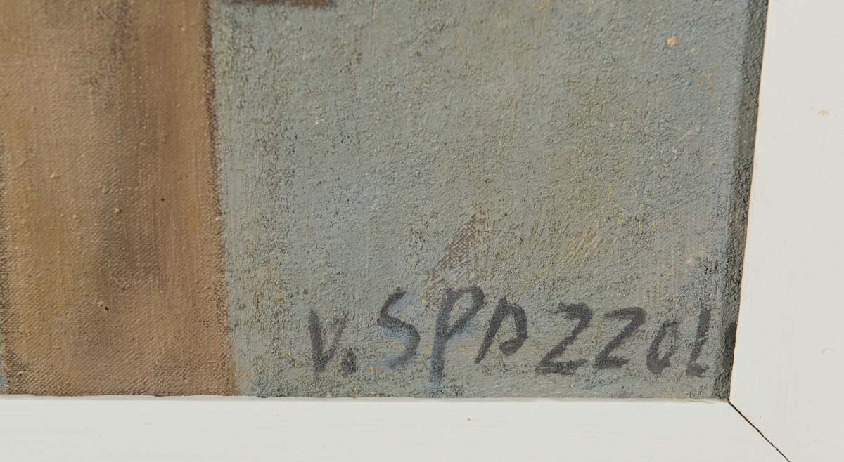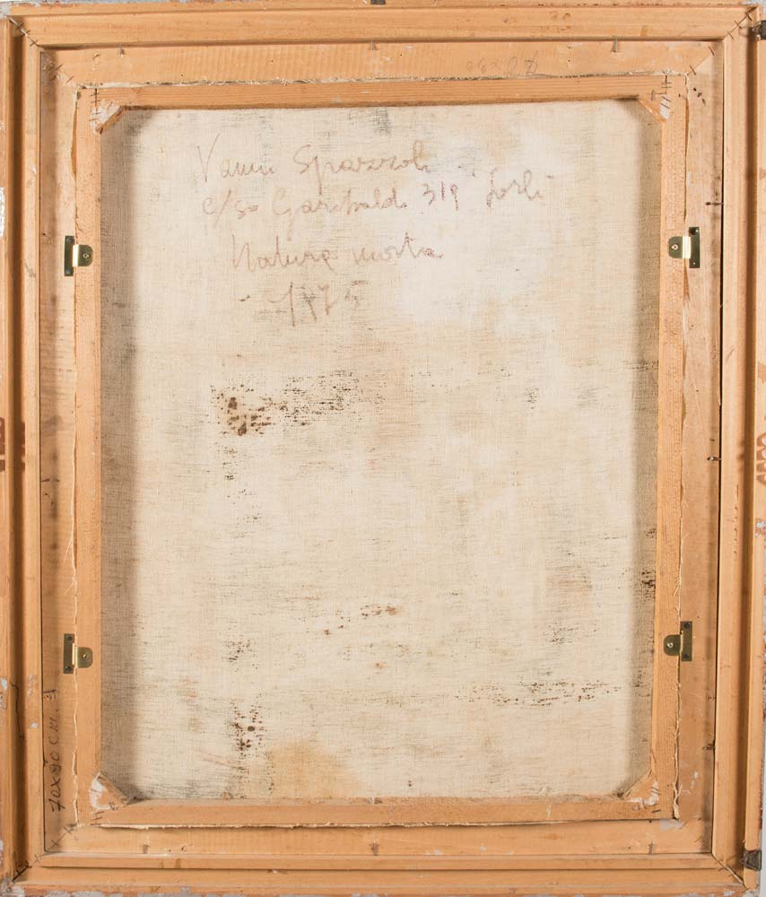 Vanni Spazzoli (Forlì 1940), “Natura morta”, 1975. Tecnica mista su tela, firmata in basso a destra V. Spazzoli, al retro reca firma, titolo e data ‘Vanni Spazzoli – Natura Morta – 1975”, H cm 90x70