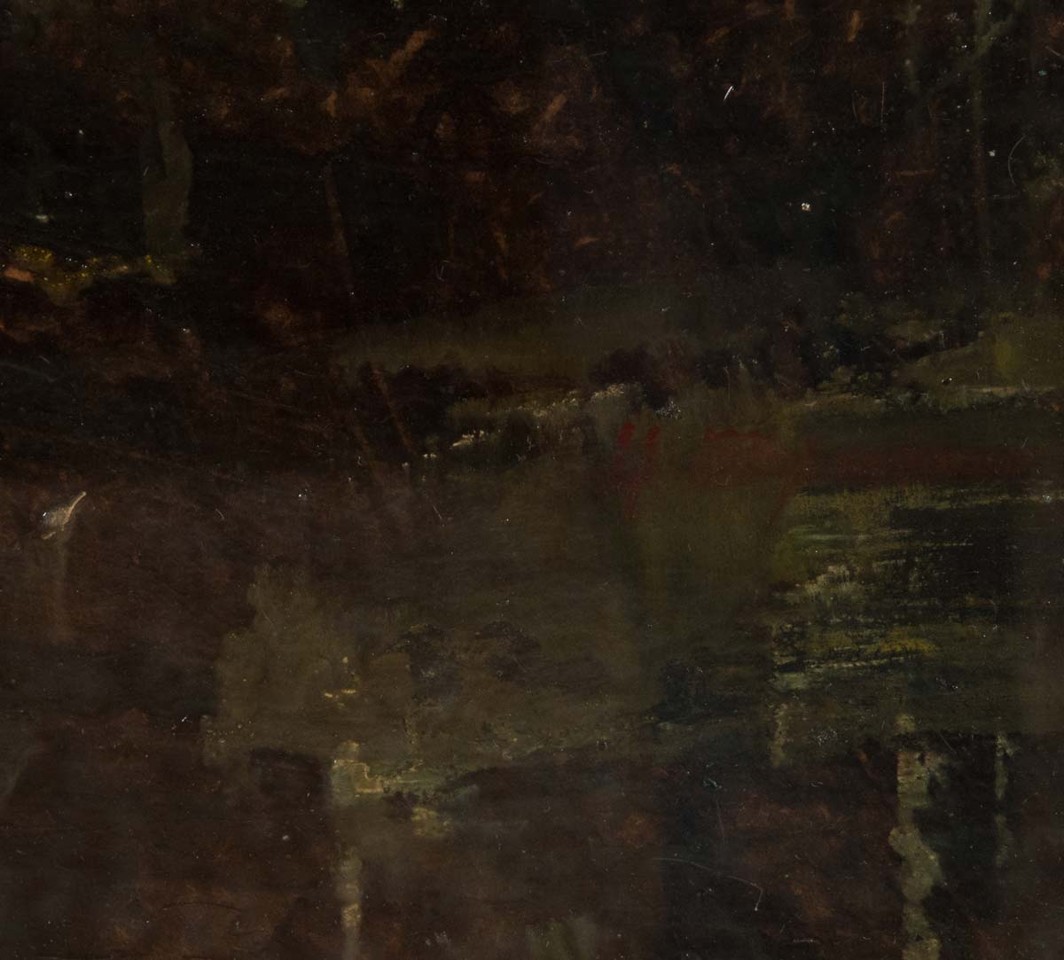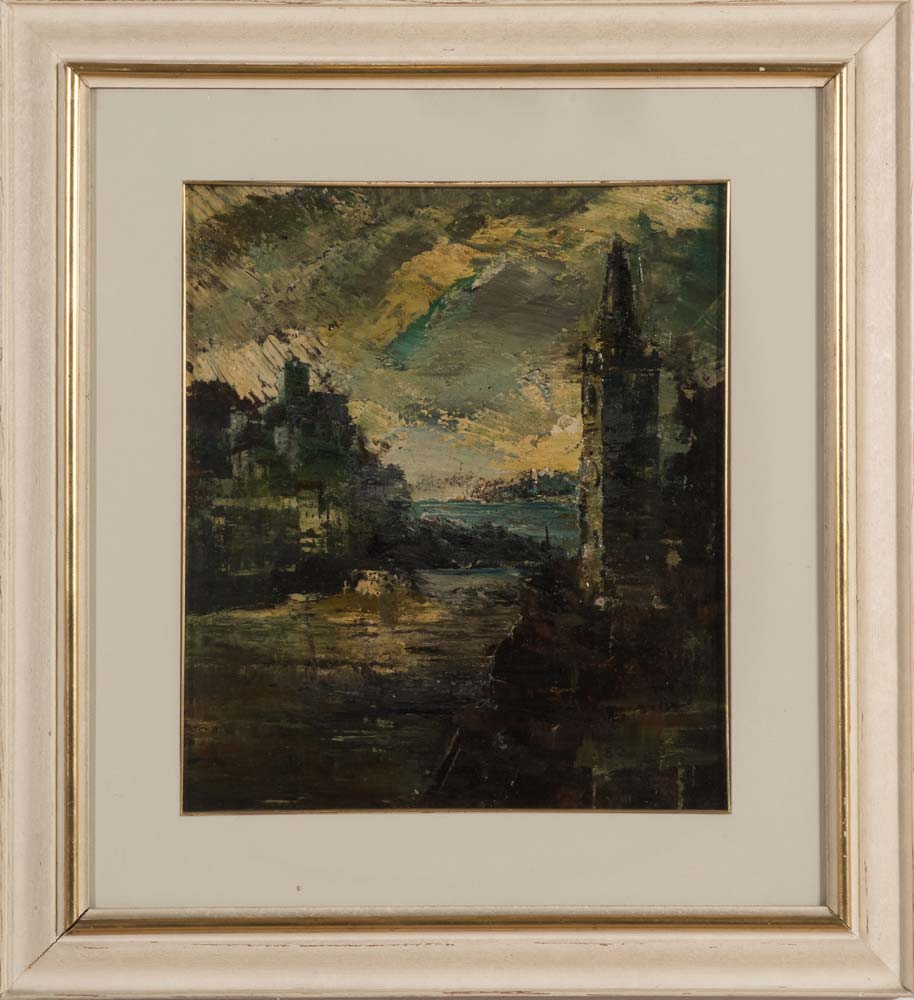Ubaldo Magnavacca (Modena 1885 – Lerici 1957), “La chiesa e il campanile”. Olio su faesite, firmato in basso a destra U. Magnavacca, H cm 52.5x46