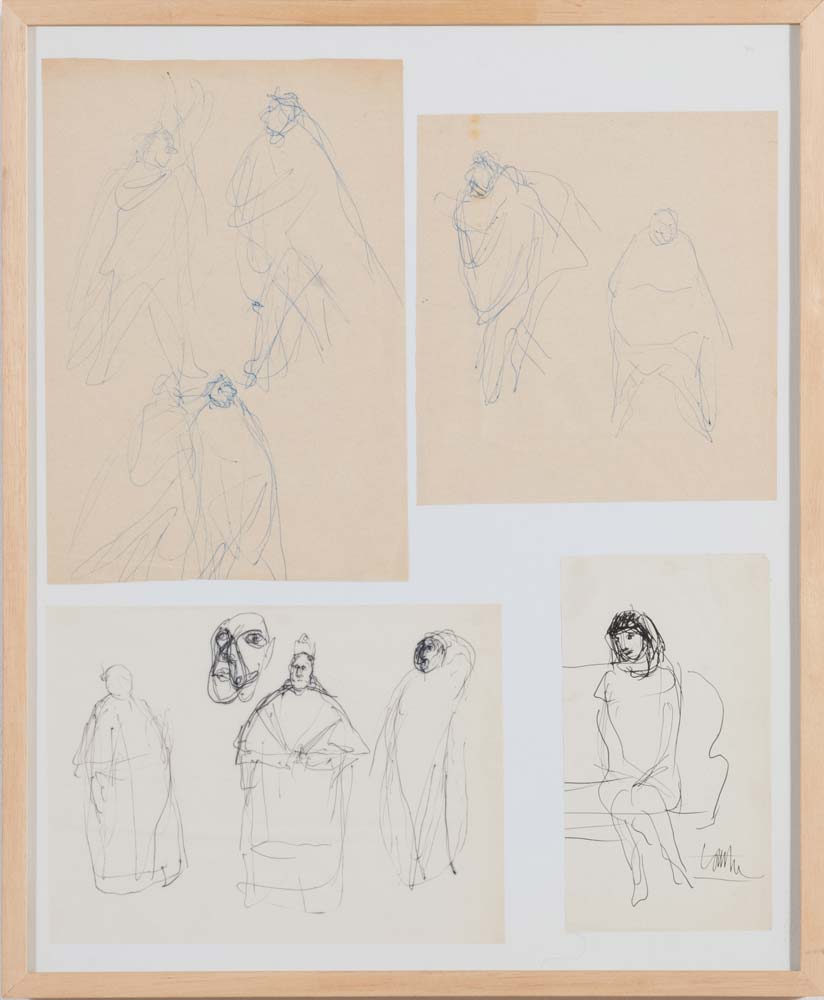 Cleto Tomba (Castel San Pietro 1898 – Bologna 1987), “Senza Titolo”. Gruppo di quattro disegni su carta di varie tecniche e dimensioni entro cornice, H cm 53x43