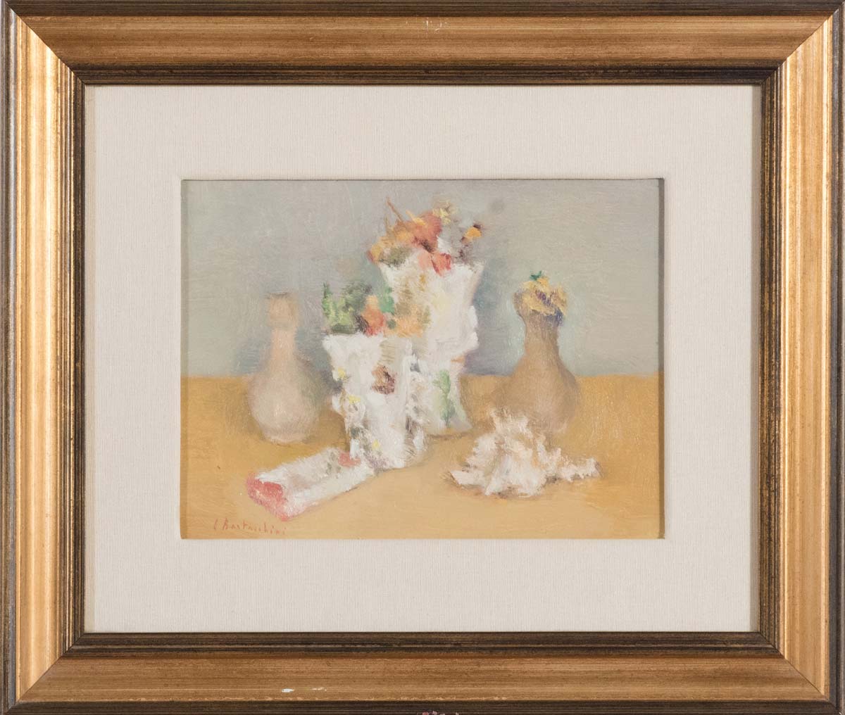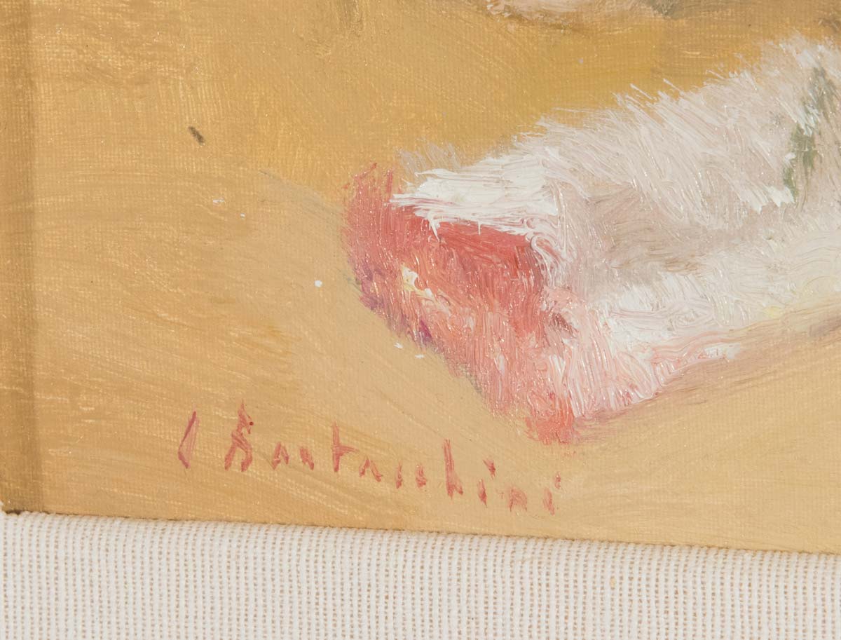 Luciano Bertacchini (Bologna 1913 - 2010), “Natura Morta”, 2002. Olio su tavola, firmato in basso a sinistra L Bertacchini, al retro reca firma e data ‘Luciano Bertacchini – 2002’,H cm 20x26