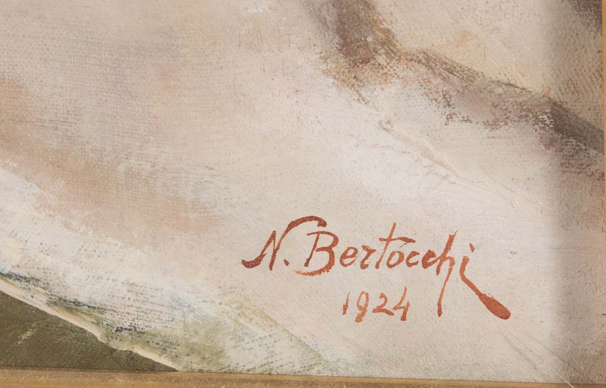 Nino Bertocchi (Bologna 1900 – Monzuno 1956), “Natura Morta con uva e melograni”, 1924. Olio su tela, firmato e datato in basso a destra N. Bertocchi 1924, H cm 48x58
