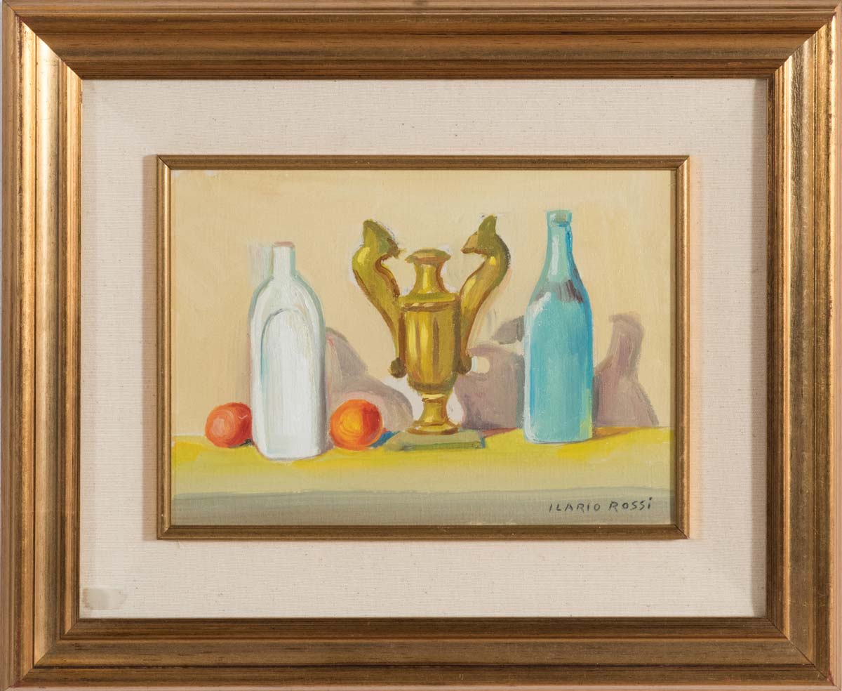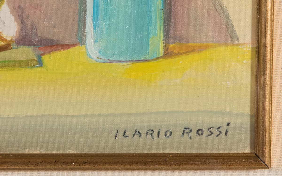 Ilario Rossi (Bologna 1911 – 1994), “Natura morta”. Olio su tela, firmato in basso a destra Ilario Rossi, al retro reca firma per autentica dell’artista ‘Olio autentico – Ilario Rossi’, H cm 25x35