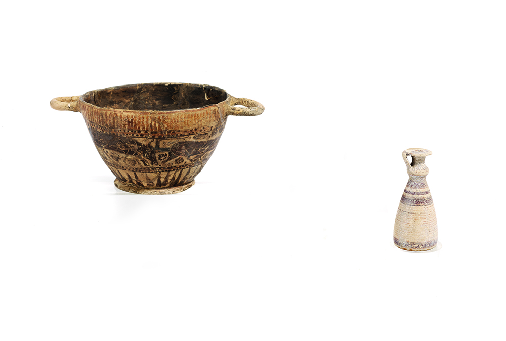 SKYPHOS E ARYBALLOS ETRUSCO CORINZI DATAZIONE: VI sec. a. C. MATERIA E TECNICA: argilla figulina camoscio; vernice bruna, suddipinture in bianco e paonazzo; dettagli resi a graffito; modellati a tornio veloce Skyphos a vasca troncocononica, piede ad anello e anse a bastoncello, decorato a tremolo, con teoria di animali pascenti a sinistra fra rosette, motivo a raggiera all’attacco col piede; aryballos con bocchello circolare, corpo troncoconico, fondo piatto, piccola ansa, decorato con fasce e bande puntiformi (2) PRODUZIONE: ceramica etrusca meridionale STATO DI CONSERVAZIONE: ricomposti da frammenti DIMENSIONI: alt. cm. 10; diam. bocca cm. 16