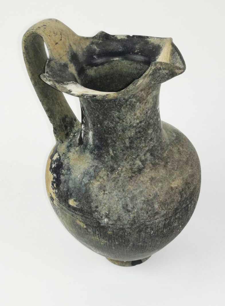 GRANDE OINOCHOE IN BUCCHERO MATERIA E TECNICA: bucchero nero lucidato a stecca, decorazione ad Bocca trilobata, collo cilindrico svasato in alto, ansa a nastro impostata sul labbro e sulla spalla, corpo ovoide, basso piede troncoconico. DECORAZIONE: sul ventre una fascia decorativa eseguita a tratti verticali ravvicinati ad incisione sottile, compresi fra due serie di solcature orizzontali; ansa ugualmente decorata a coppie di solcature. PRODUZIONE: ceramica etrusca centro meridionale STATO DI CONSERVAZIONE: incrinata e molto incrostata DIMENSIONI: alt. cm. 24,8, diam. cm. 13,9. DATAZIONE: seconda metà VII sec. a. C.