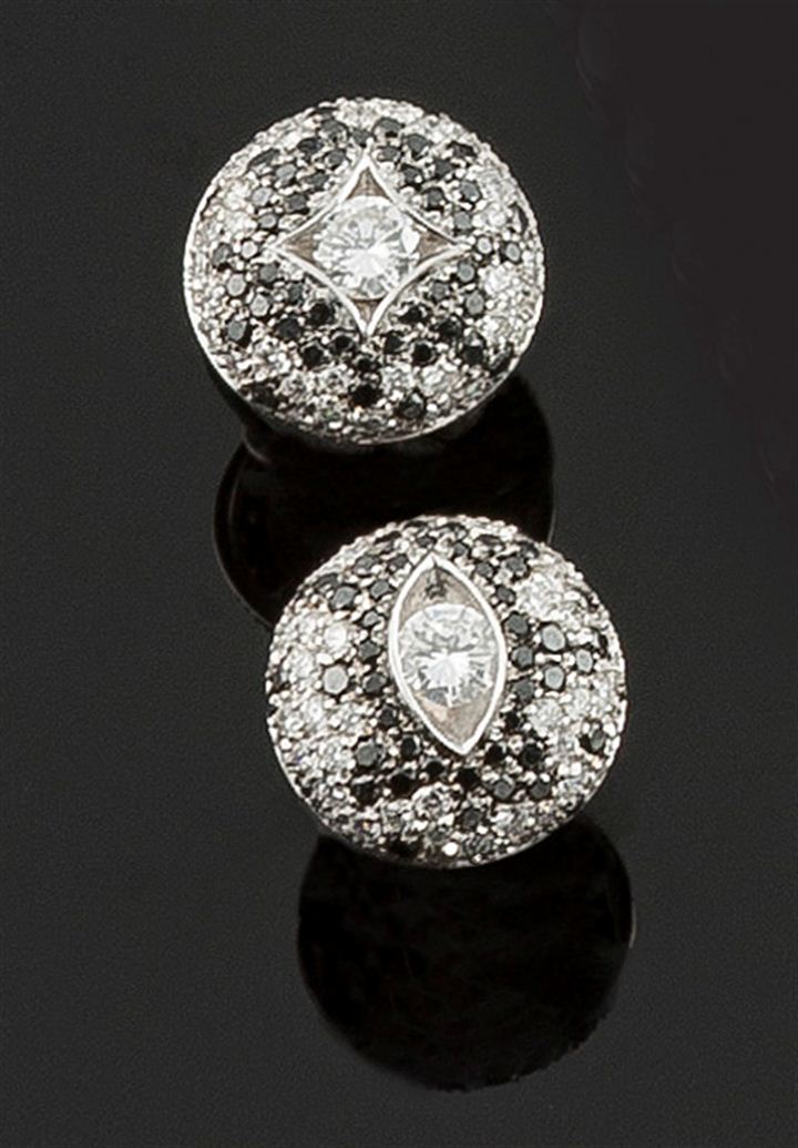 due diamanti taglio brillante per complessivi ct 0,50 ca, contornati da diamanti taglio brillante di colore nero per complessivi ct 0,60 ca ed di colore bianco per complessivi ct 0,70 ca