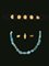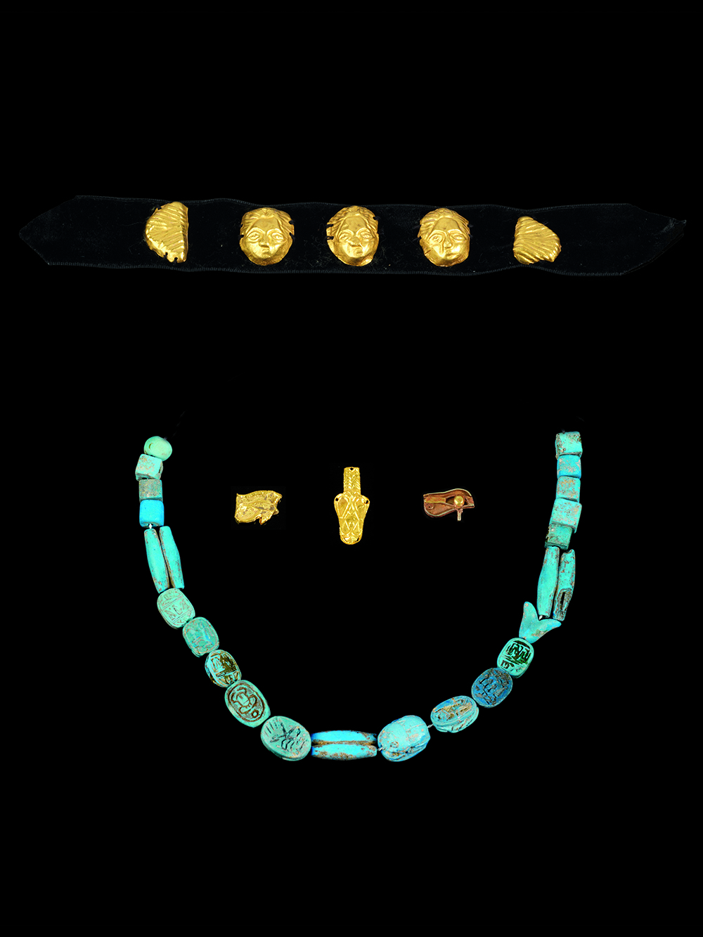 COLLANA, ELEMENTI IN ORO E ARMILLA DATAZIONE: Medio e Nuovo regno, VII-VI sec. a. C. MATERIA E TECNICA: faience egiziana, lamina d’oro sbalzata Collana in faience azzurra formata da nove scarabei con parte inferiore incisa con geroglifici e tredici vaghi di forme diverse; due occhi udjat ed una trachea sema in lamina d’oro; cinque elementi in lamina d’oro pertinenti alla decorazione di un abito o di un’armilla, due modellati a elementi vegetali e tre a volti umani stilizzati (9) PRODUZIONE: cultura egiziana e cultura frigia STATO DI CONSERVAZIONE: integri DIMENSIONI: lungh. cm 3 e cm 2 PROVENIENZA: Casa d’Aste Pandolfini, Firenze