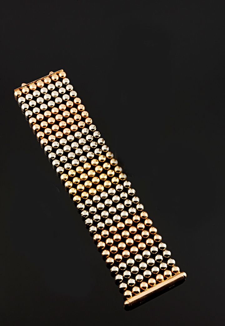 Bracciale composto da centonovantasei boules in oro giallo, rosso e bianco, alterate e disposte a file