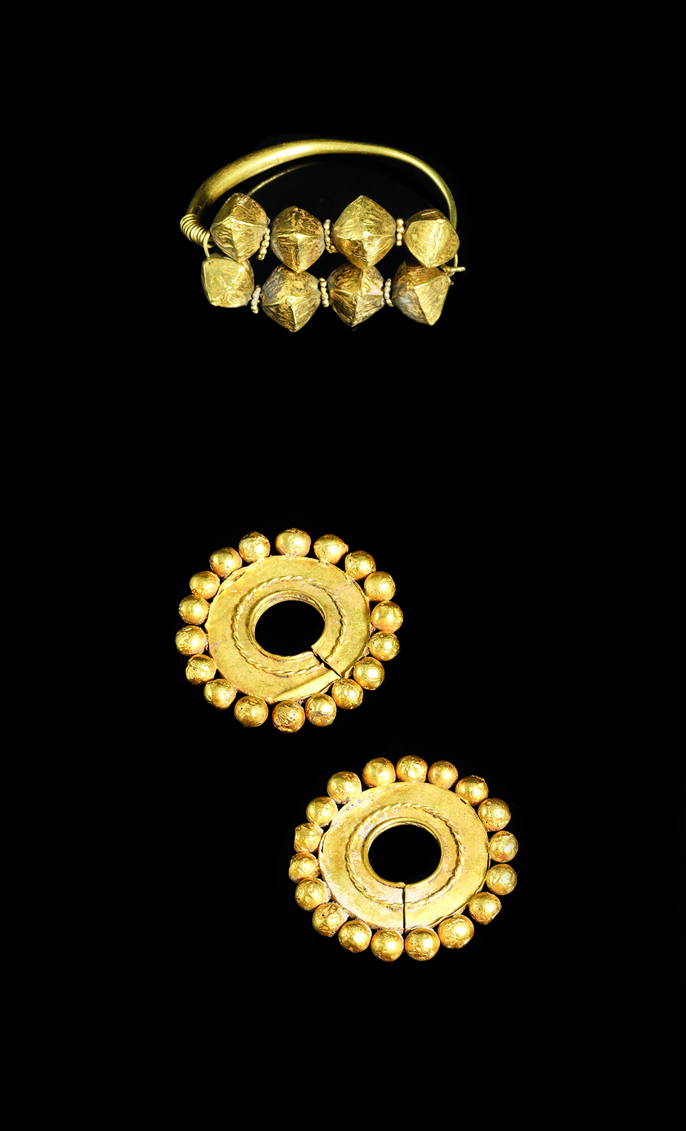 TRE ORECCHINI IN ORO DATAZIONE: II millennio a. C. MATERIA E TECNICA: oro laminato e cesellato Tre orecchini in oro, due in forma circolare con bordo esterno formato da piccole sfere affiancate ed altro decorato da otto globetti cuspidati (3) PRODUZIONE: cultura battriana, Afghanistan STATO DI CONSERVAZIONE: integri PROVENIENZA: Paropamiso, di Paciello Michel & C., San Marco Venezia