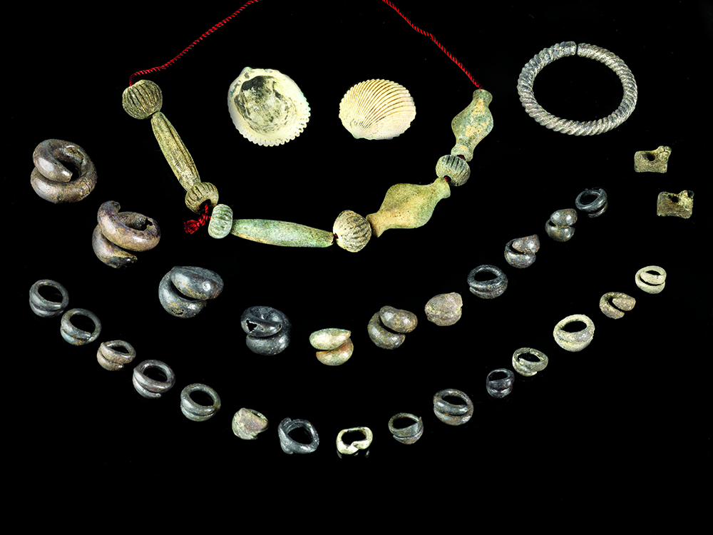 RARO CORREDO FEMMINILE ELAMITA DATAZIONE: III millennio a.C. MATERIA E TECNICA: argento, faience e conchiglia Nove vaghi da collana in faience in forma di perle scannellate, elementi tubolari e a clessidra; due conchiglie con tracce di colore; un’armilla in argento a tortiglione; ventisei fermatrecce in argento di forma e dimensioni variabili; due piccoli animali accucciati in argento con foro passante per la sospensione (40) PRODUZIONE: cultura elamita STATO DI CONSERVAZIONE: integro Il corredo è relativo a una sepoltura femminile di una tomba reale mesopotamica e le due conchiglie contenevano originariamente il bistro per gli occhi
