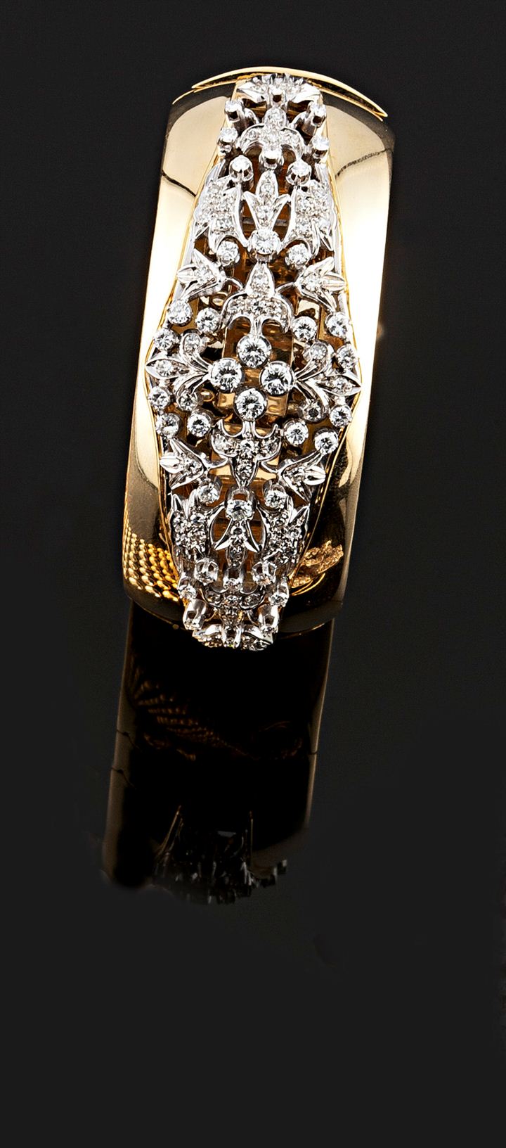 Splendido bracciale rigido in oro giallo e bianco, impreziositi da diamanti taglio brillante e 8/8 per complessivi ct 3,20 ca