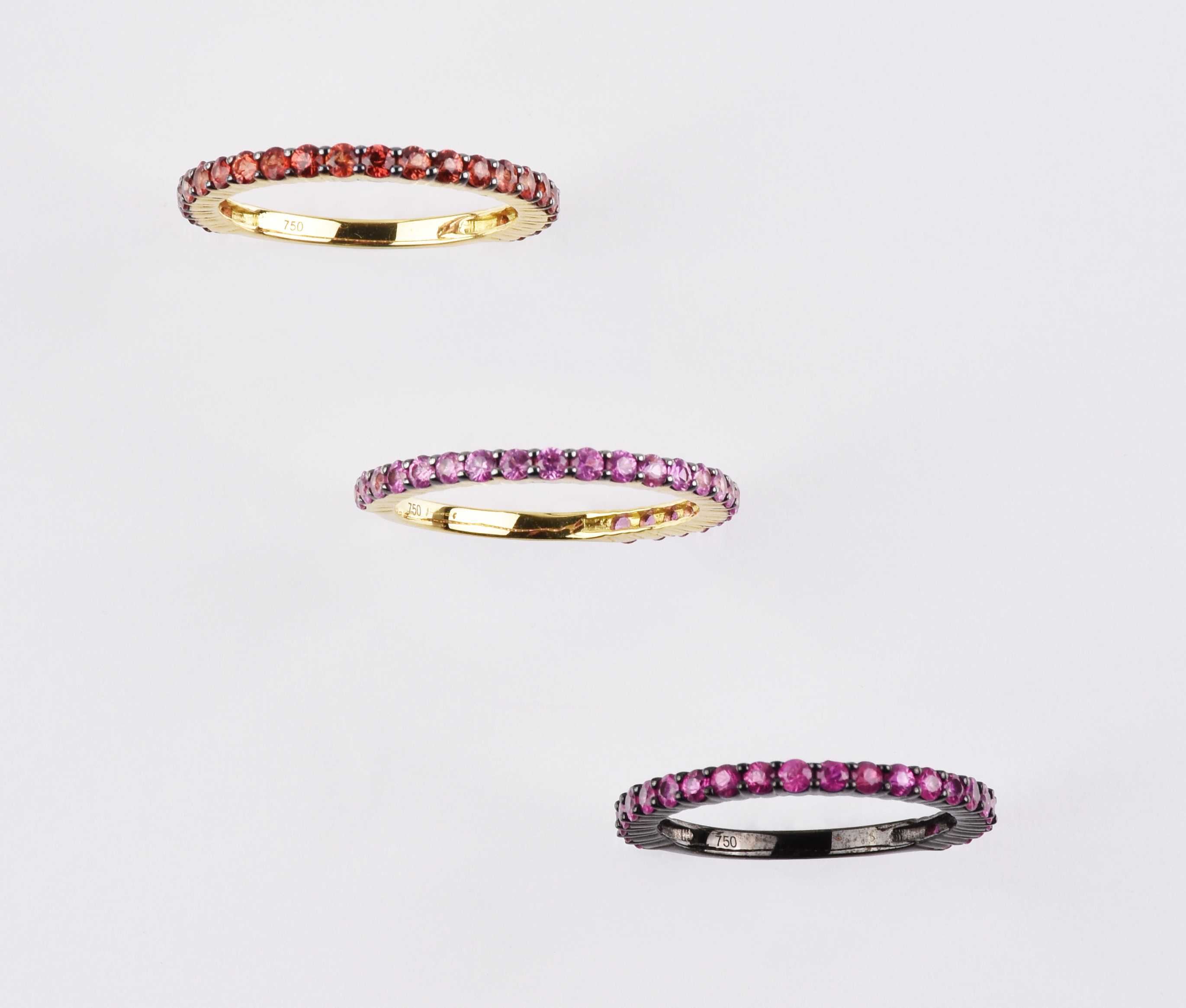 TRE ANELLI ETERNITY IN ORO GIALLO, ORO BRUNITO, ZAFFIRI MULTICOLOR E RUBINI rispettivamente ad una linea di rubini, zaffiri arancioni e rosa taglio brillante rotondo entro montature in oro brunito e giallo, parte posteriore del gambo non decorata, punzone 750, g 5,3 mis. 11-11,5-12 Stato di conservazione complessivo ottimo. THREE ETERNITY RINGS IN BLACK AND YELLOW GOLD, RUBIES, ORANGE AND PINK SAPPHIRES Overall excellent condition.